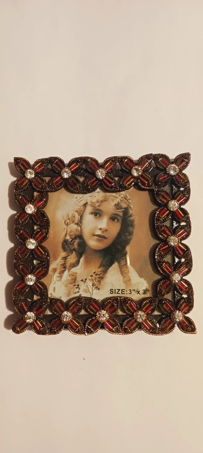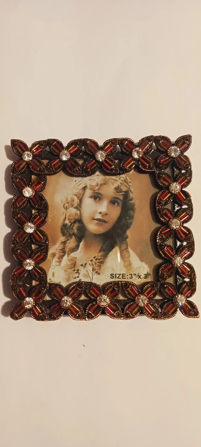 This decorative photo frame features a vintage-inspired design with intricate red and gold beadwork and sparkling rhinestones. It's designed to hold a 3"x3" photo. A lovely way to display a cherished memory!!! 4"×4". Excellent condition. ALL MY PRICES ARE NEGOTIABLE!