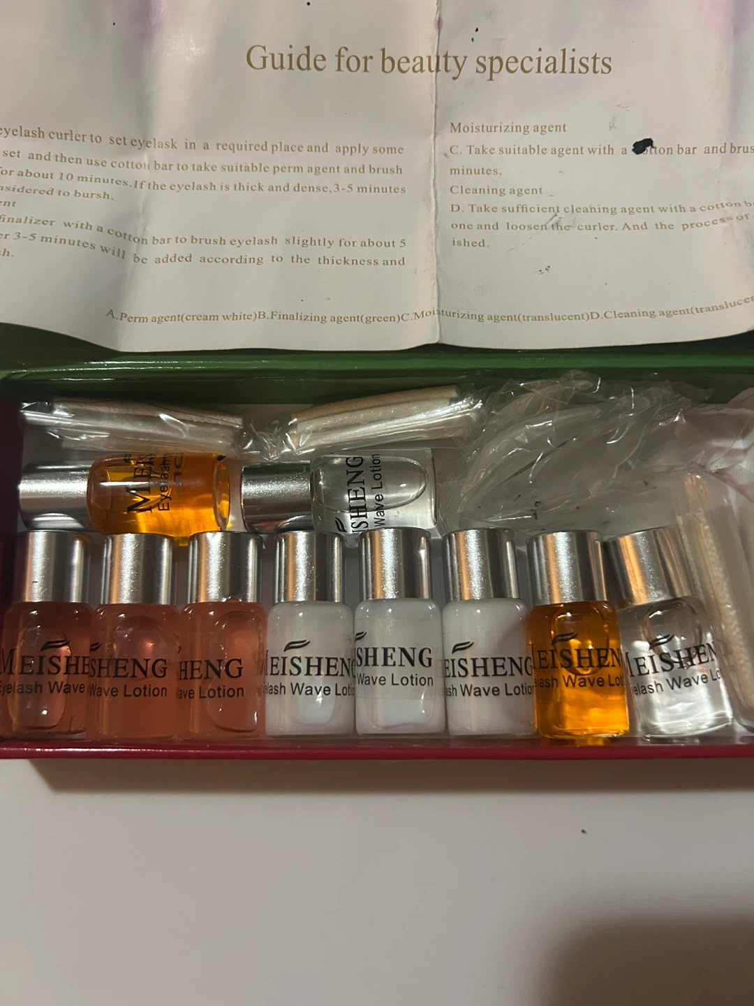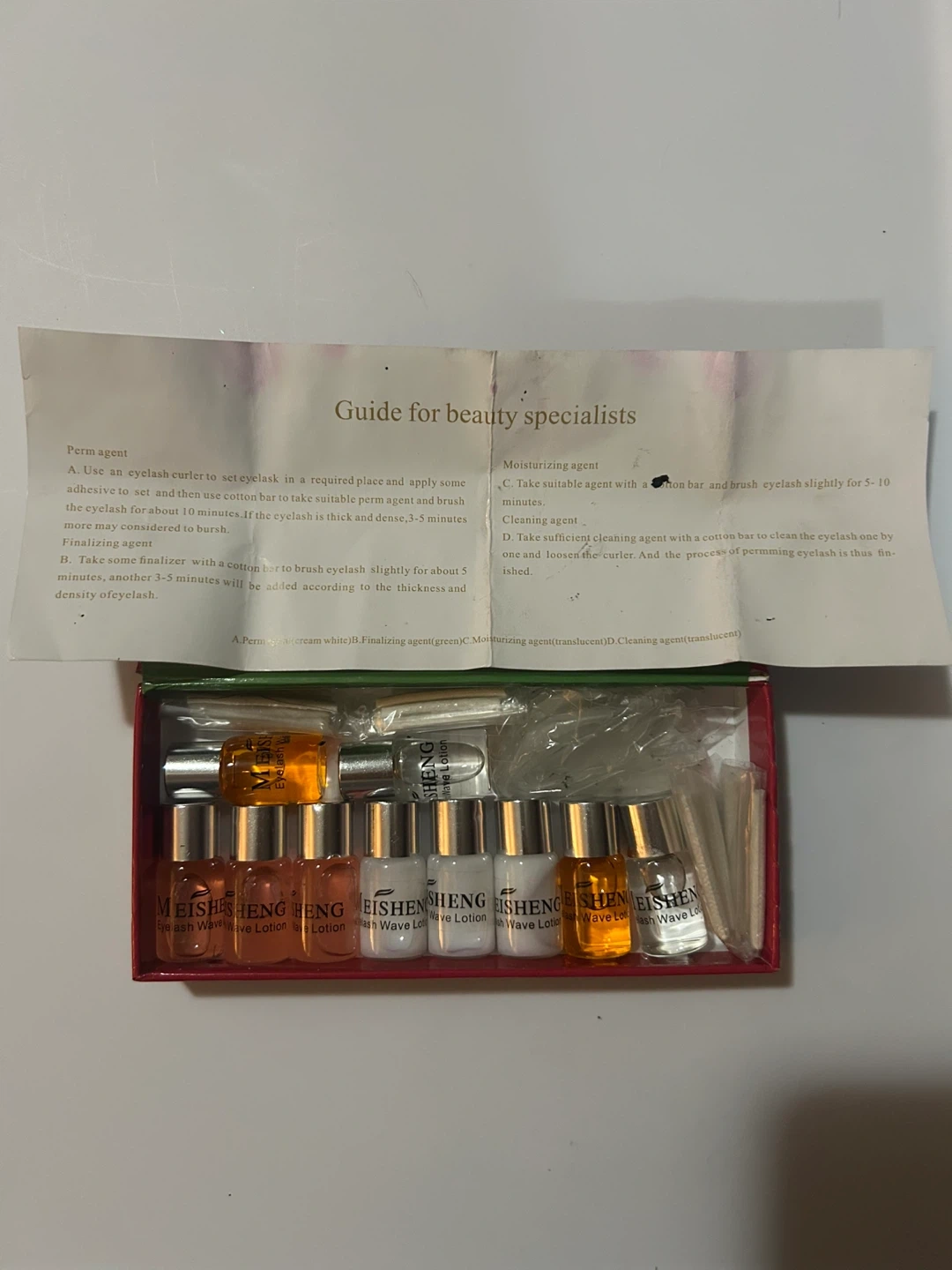 This lash lifting kit includes perm agent, finalizing agent, moisturizing agent, and cleaning agent. It's designed for professional lash curling. The set comes with multiple small bottles for each solution. Not used!