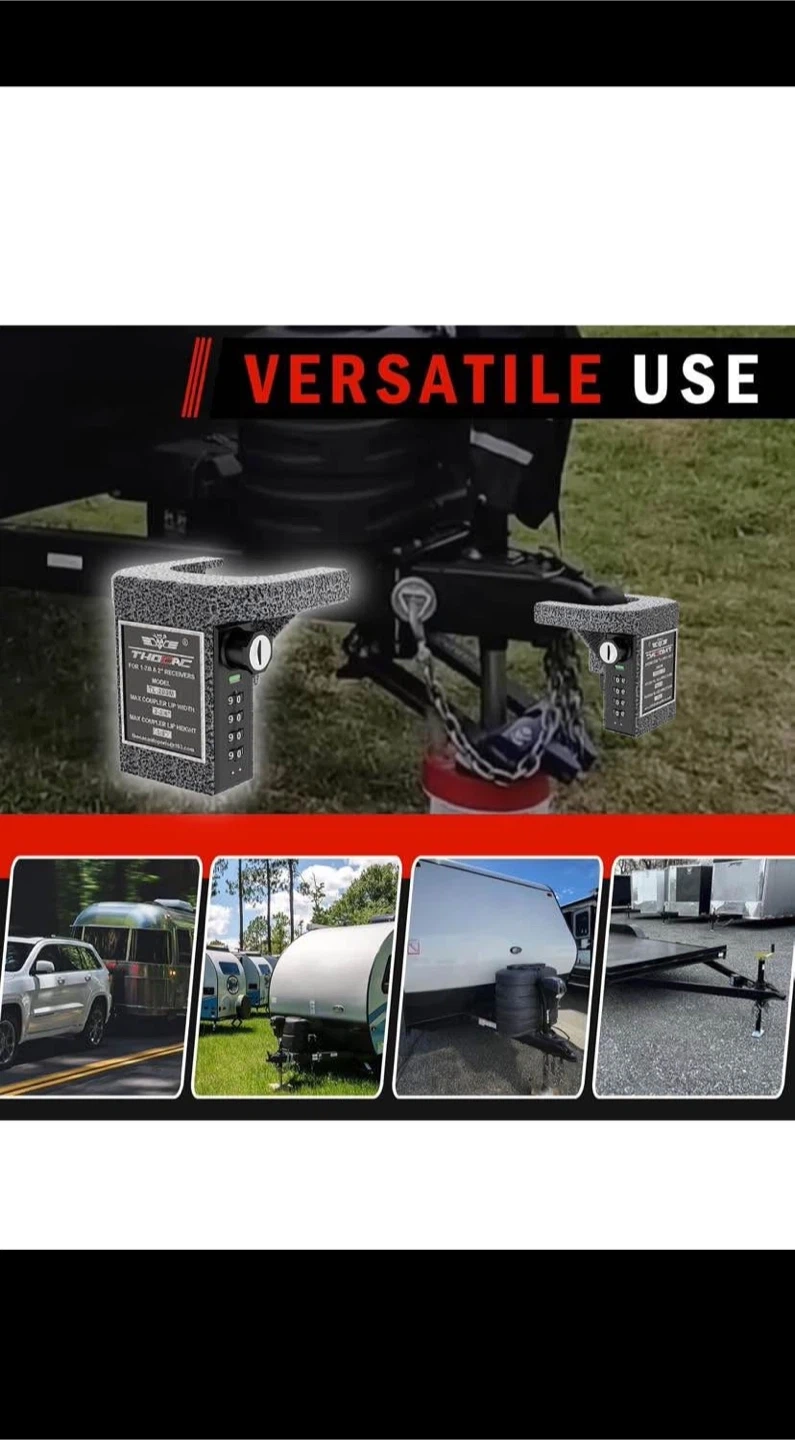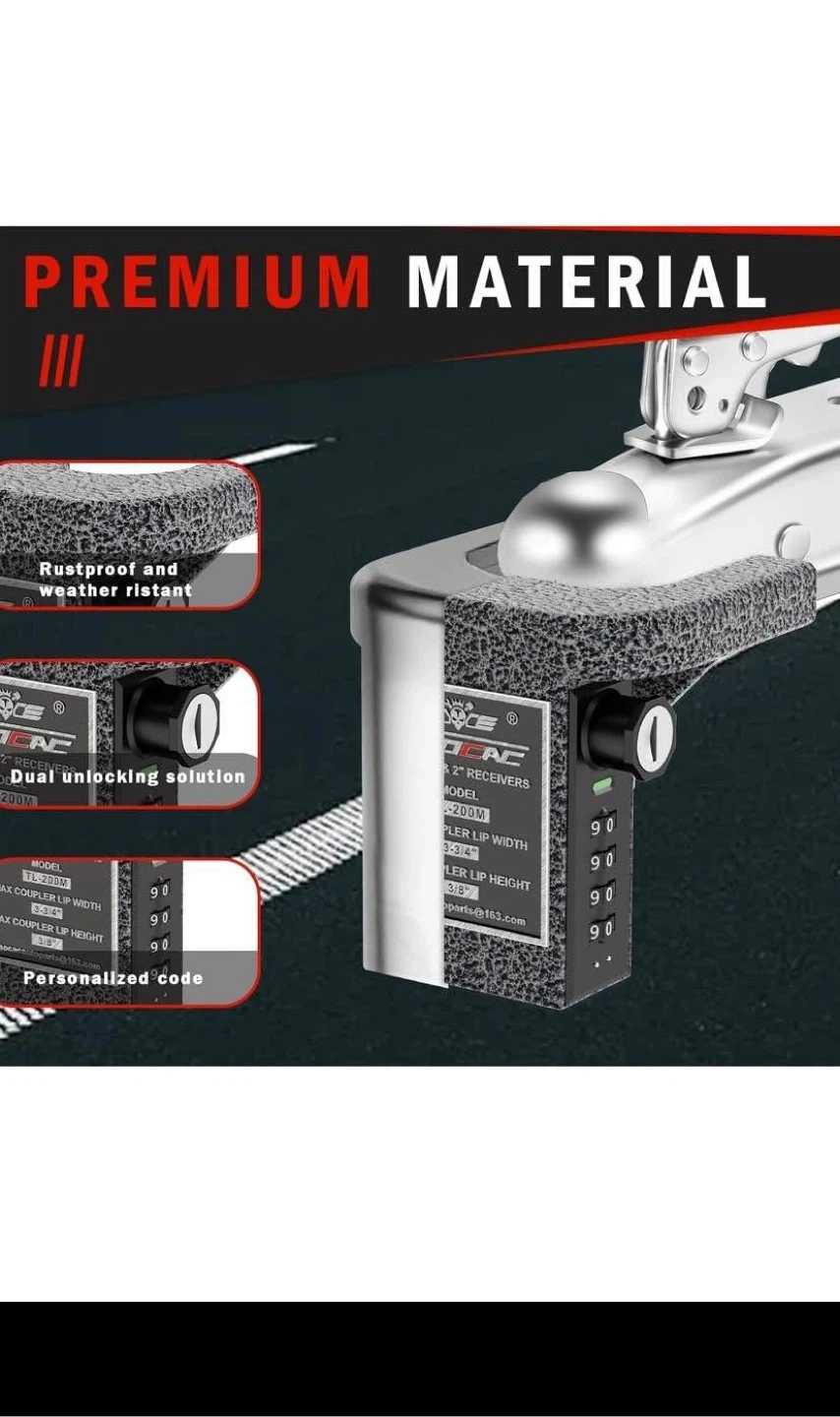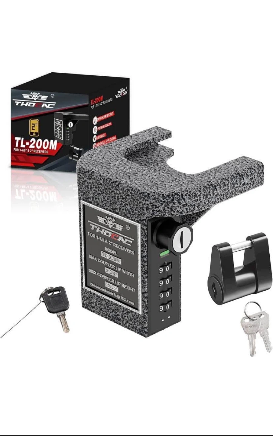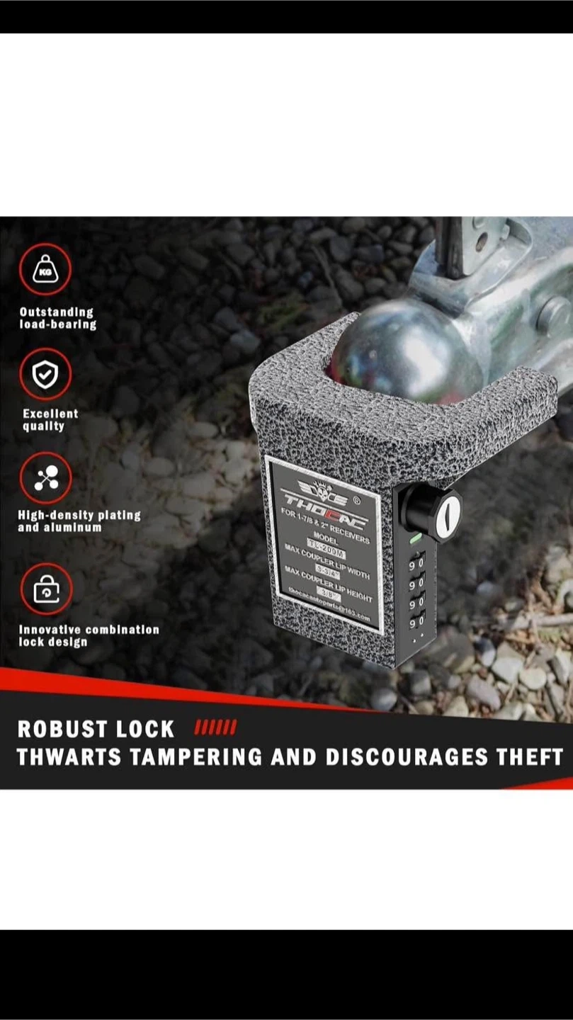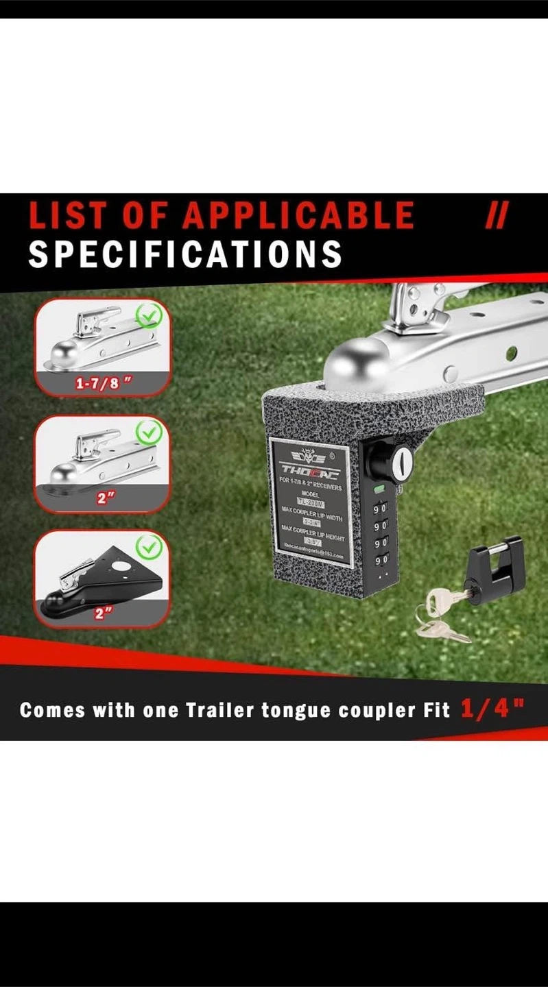 This trailer hitch coupler lock kit is designed for 1-7/8" and 2" receivers. It features a robust lock design that thwarts tampering and discourages theft. The lock is constructed from high-density plating and aluminum for excellent quality and outstanding load-bearing capacity.