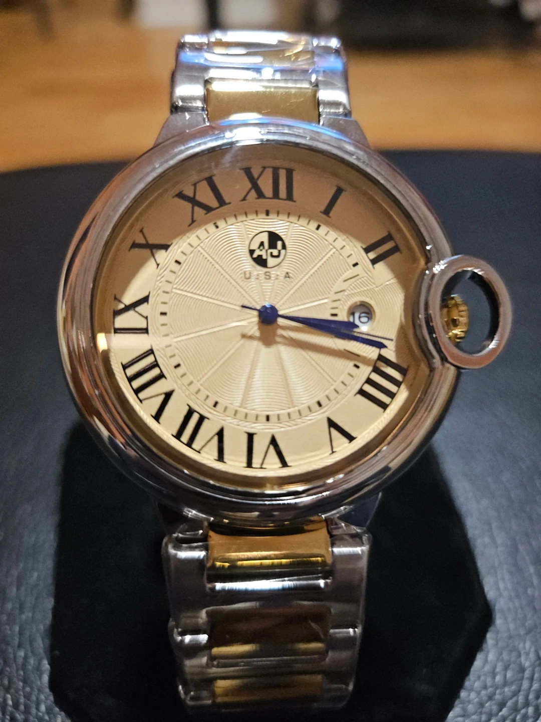 AJ watch with a two-tone stainless steel band and a champagne-colored dial. It features Roman numerals and a date window. Water resistant up to 10 BAR. Includes original packaging.