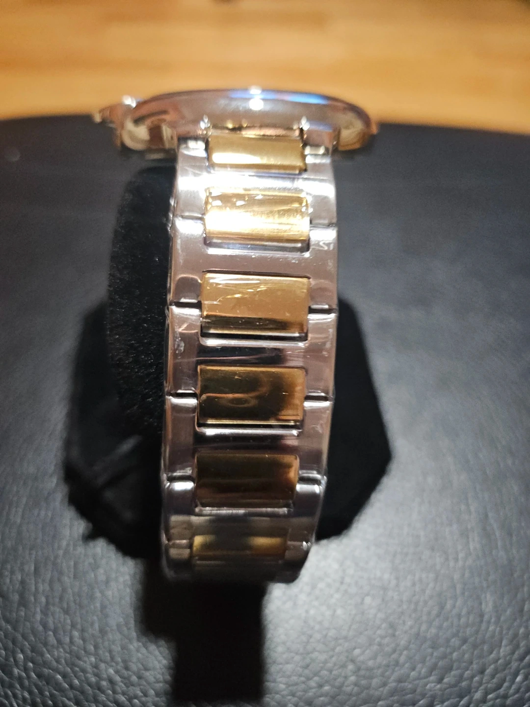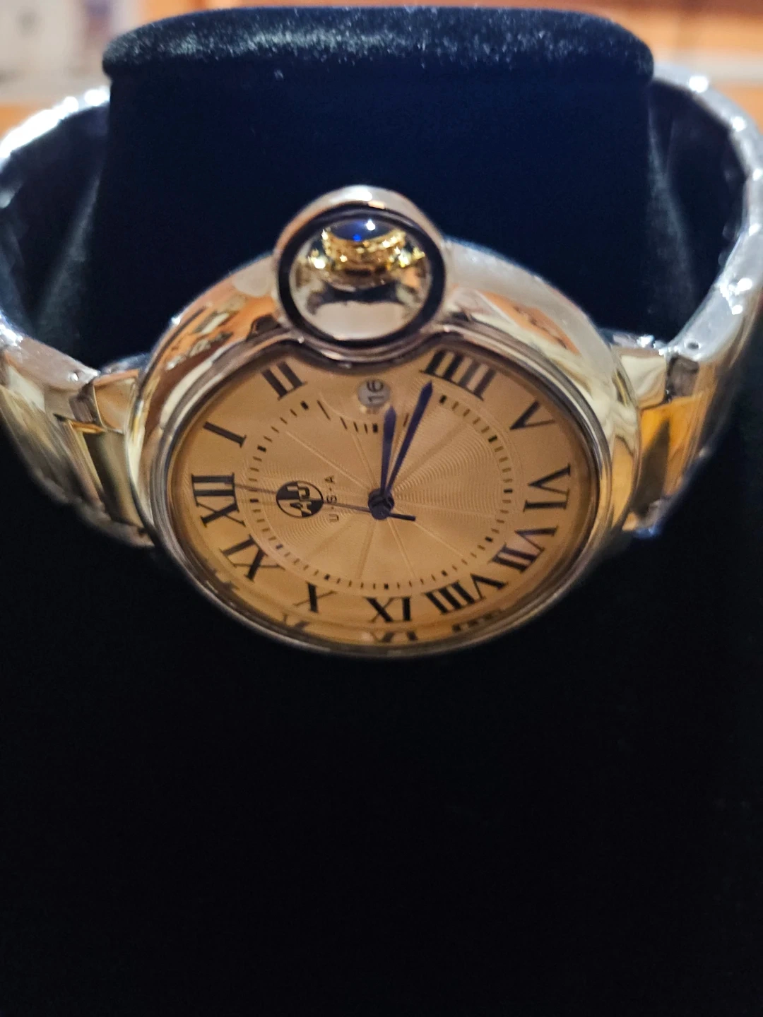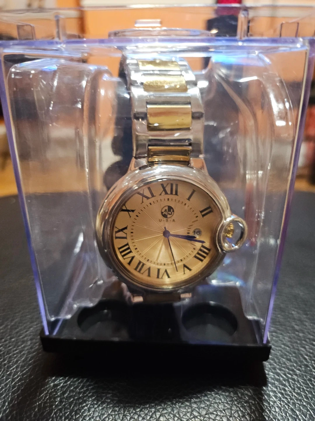 AJ watch with a two-tone stainless steel band and a champagne-colored dial. It features Roman numerals and a date window. Water resistant up to 10 BAR. Includes original packaging.