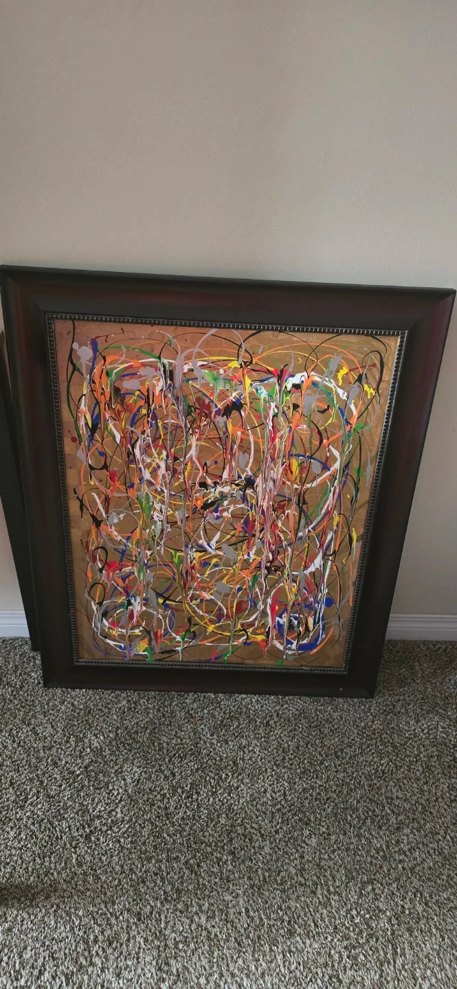Framed abstract drip painting. Features a vibrant multi-coloured splatter design on a brown background. Comes in a dark brown wood-look frame. Ready to hang!