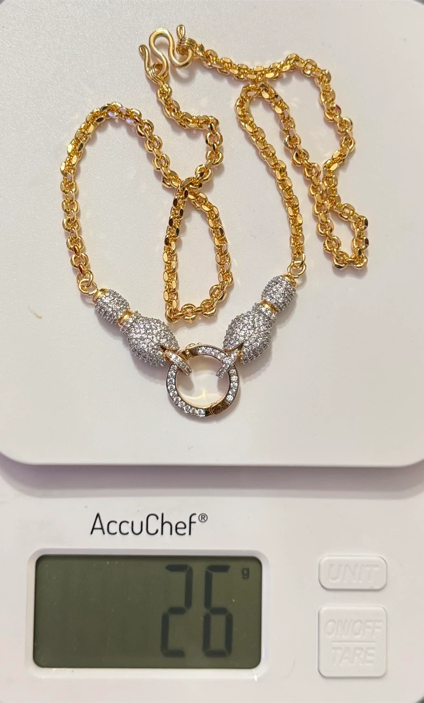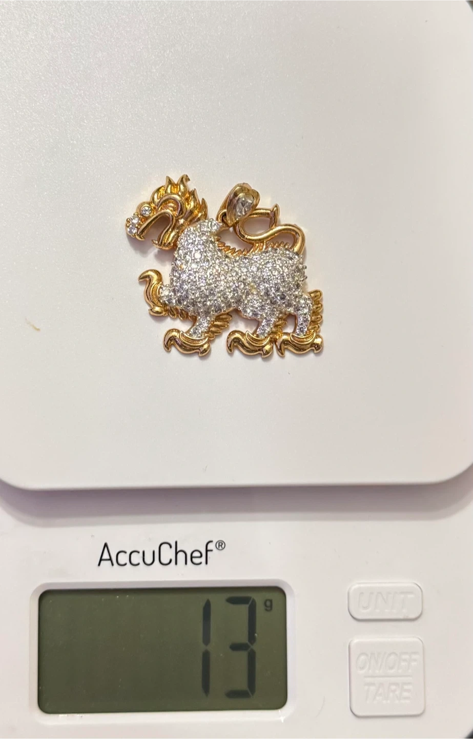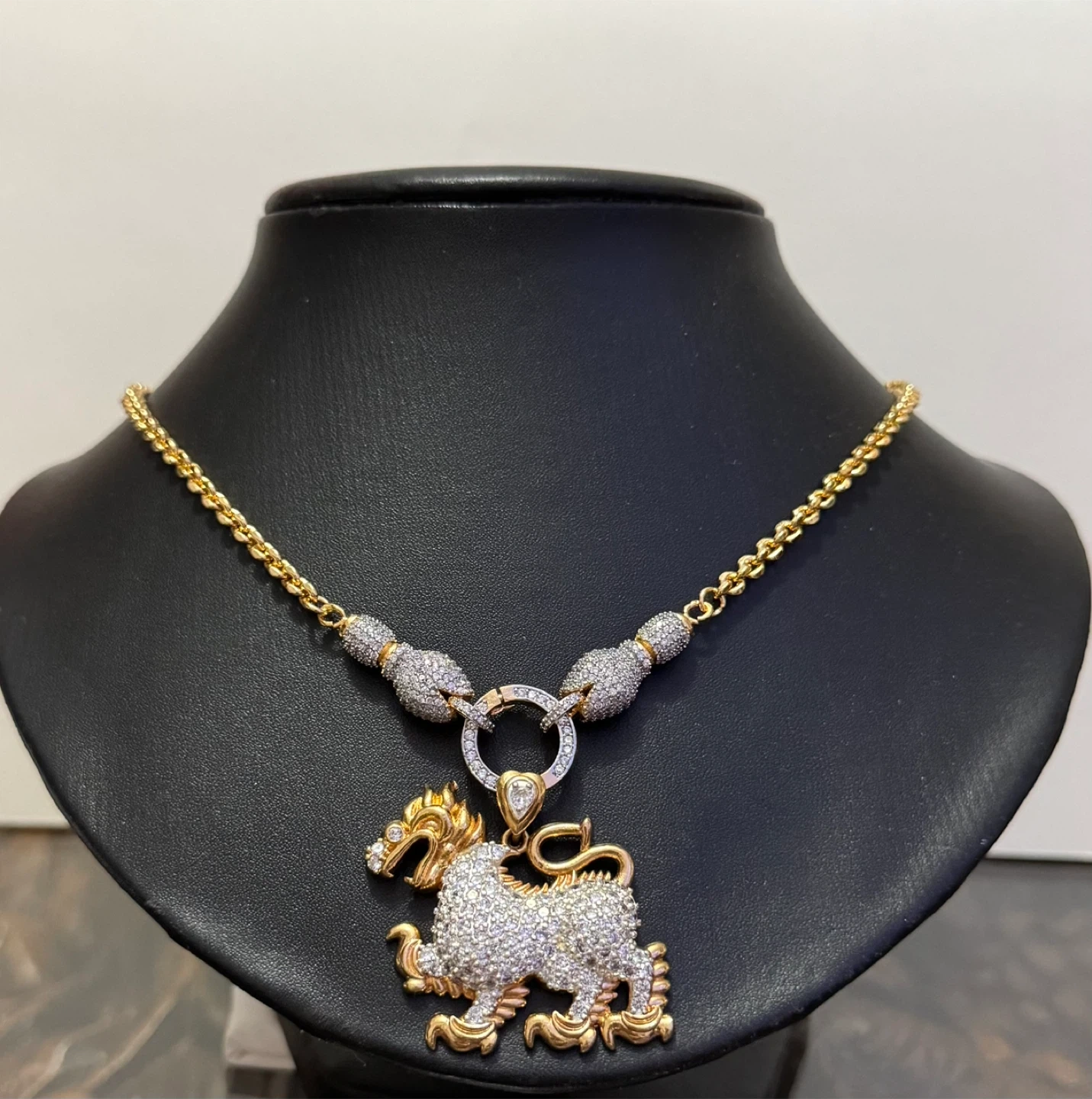 Real platinum gold necklace featuring a pendant adorned with Japanese diamonds in the shape of a lion. The chain and clasp are gold, with additional diamond accents on the chain near the pendant. It weighs 26 grams total, with the pendant weighing 13 grams. This piece is sure to add sparkle to any outfit!
