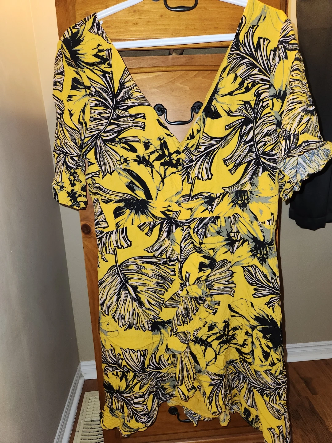 This Guess dress has a vibrant yellow tropical print with black and white leaf accents. It features a flattering V-neckline and short flutter sleeves. Size XL.