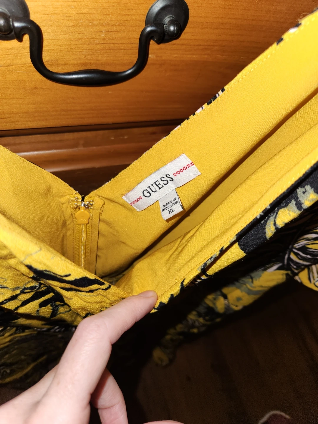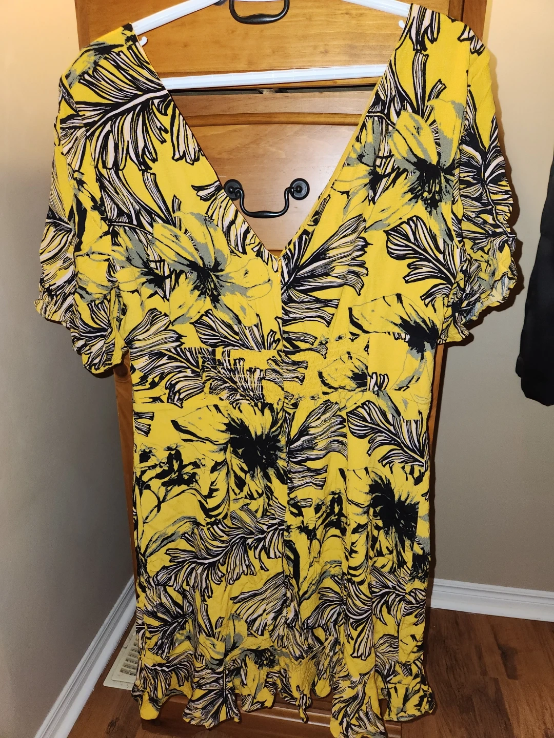 This Guess dress has a vibrant yellow tropical print with black and white leaf accents. It features a flattering V-neckline and short flutter sleeves. Size XL.