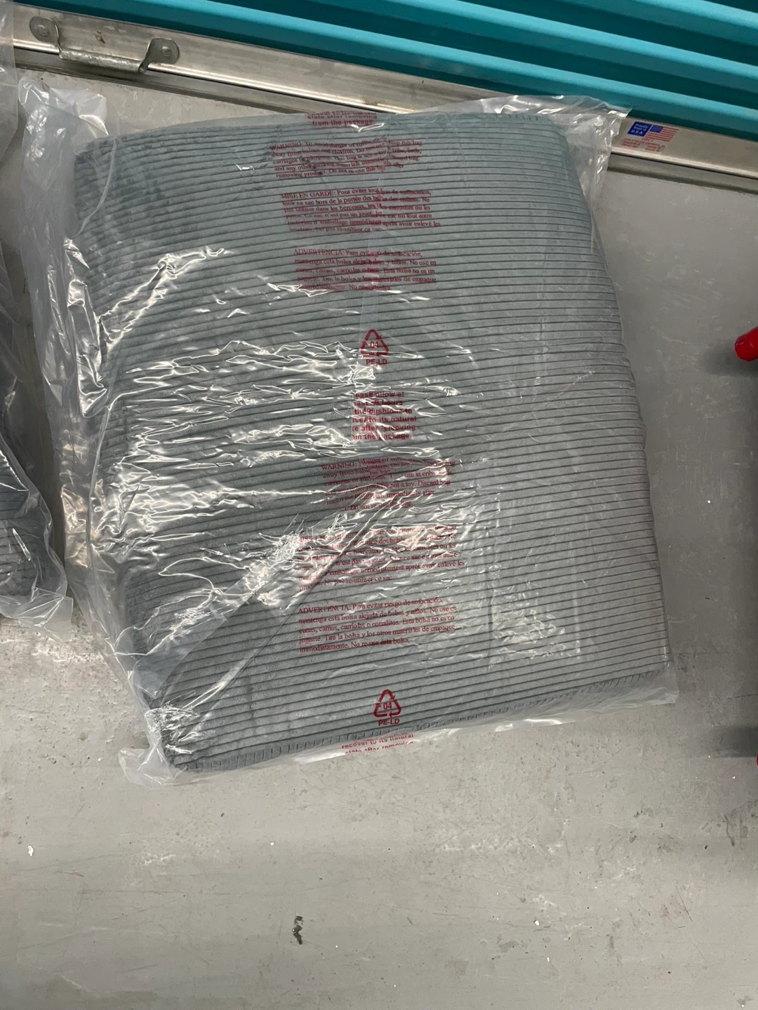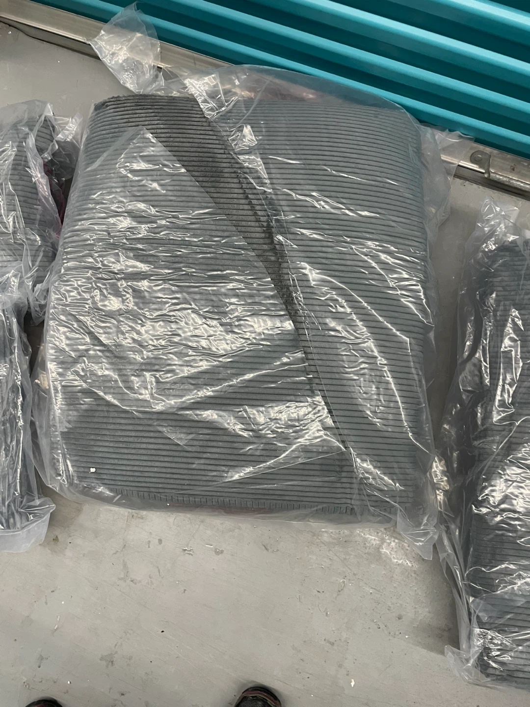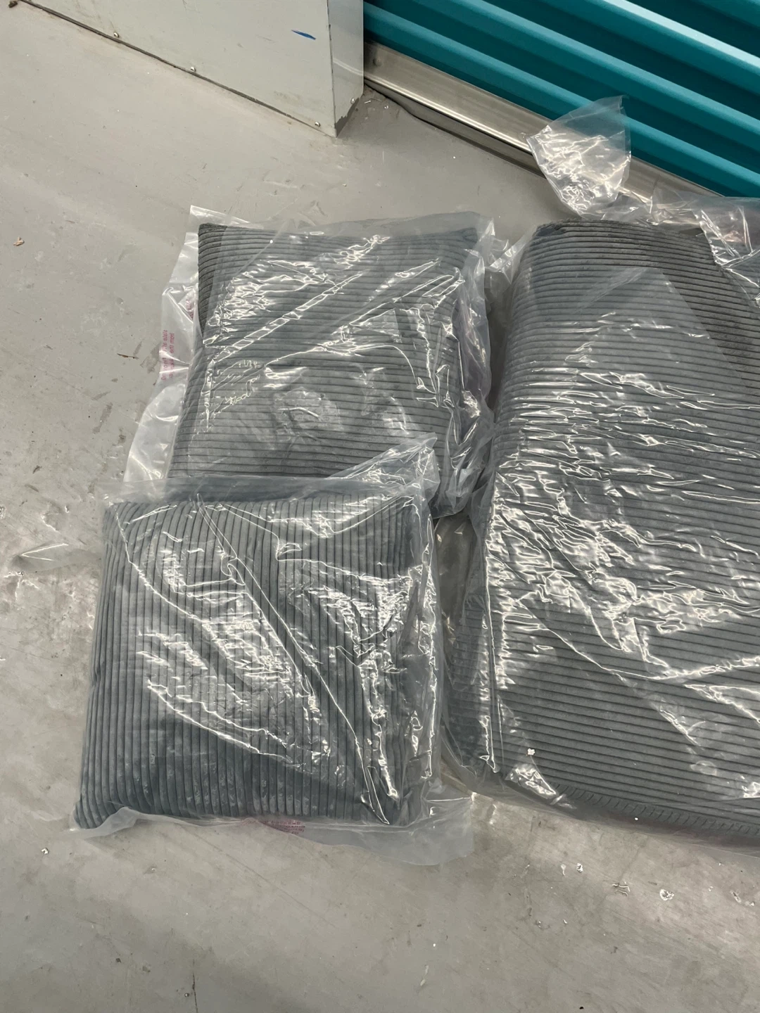 Three grey corduroy throw pillows. They're soft and comfortable, adding a nice touch to any couch or chair. Pillow covers are made of polyester. Each pillow has a subtle striped pattern.