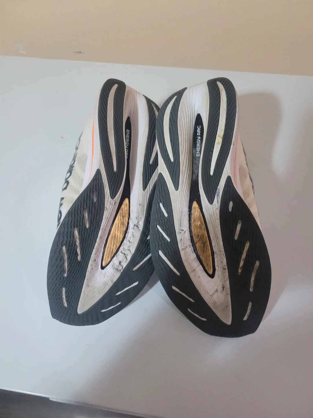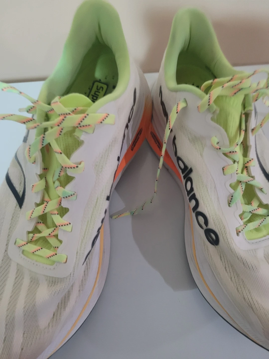 New Balance running shoes in white with neon green accents. These shoes are a men's US medium size. They were manufactured in April 2023. Great for hitting the pavement!