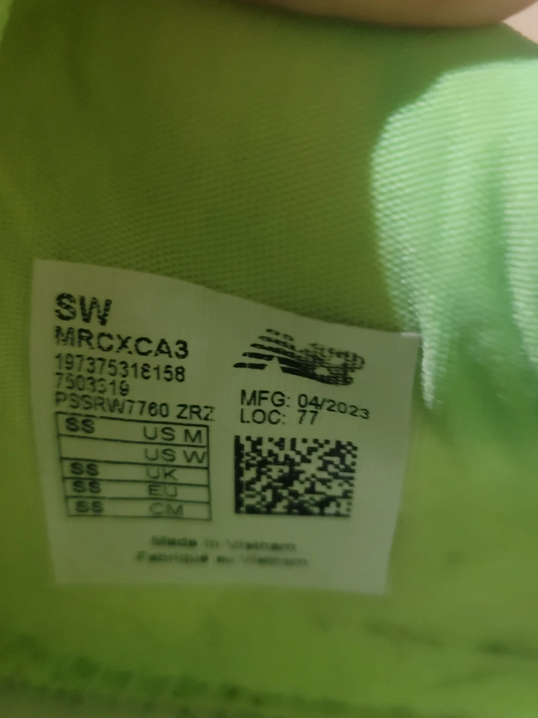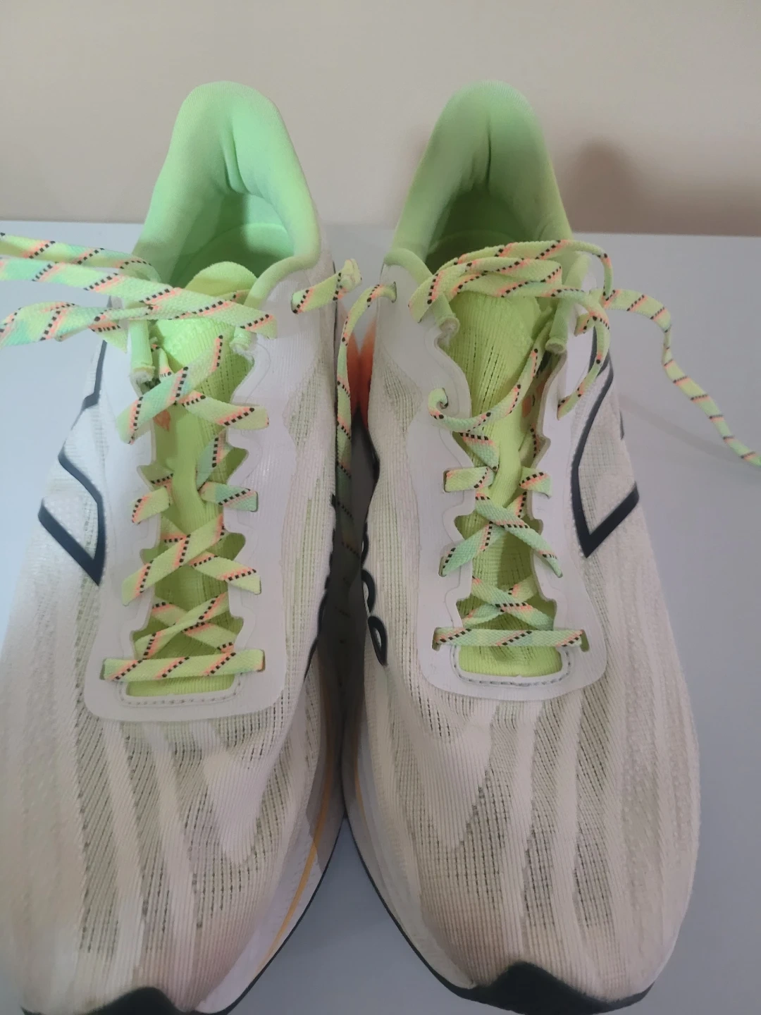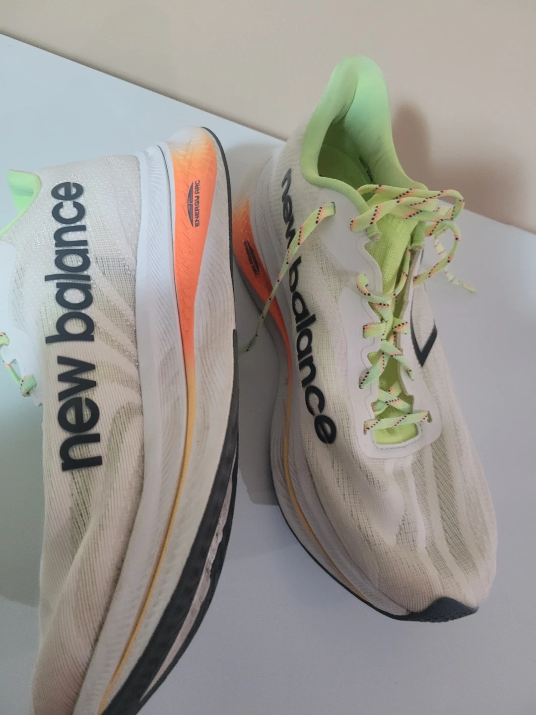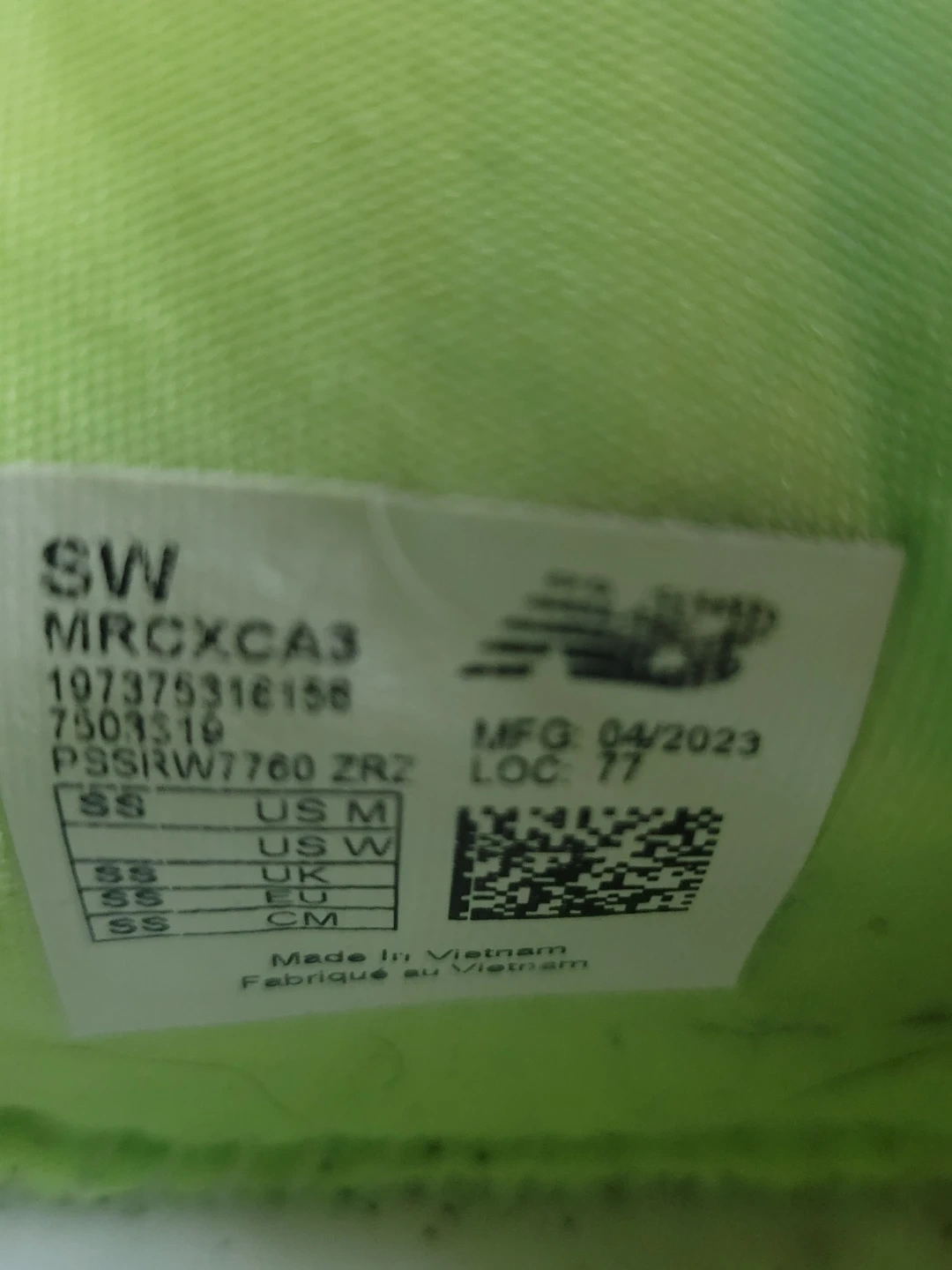 New Balance running shoes in white with neon green accents. These shoes are a men's US medium size. They were manufactured in April 2023. Great for hitting the pavement!