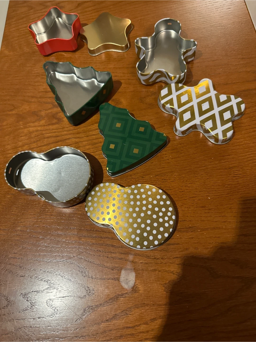 You'll get assorted holiday-themed metal box perfect for storing treats or small gifts. These tins are made of metal and feature fun shapes like stars, trees, and gingerbread men. They're great for organizing small items or giving homemade goodies!