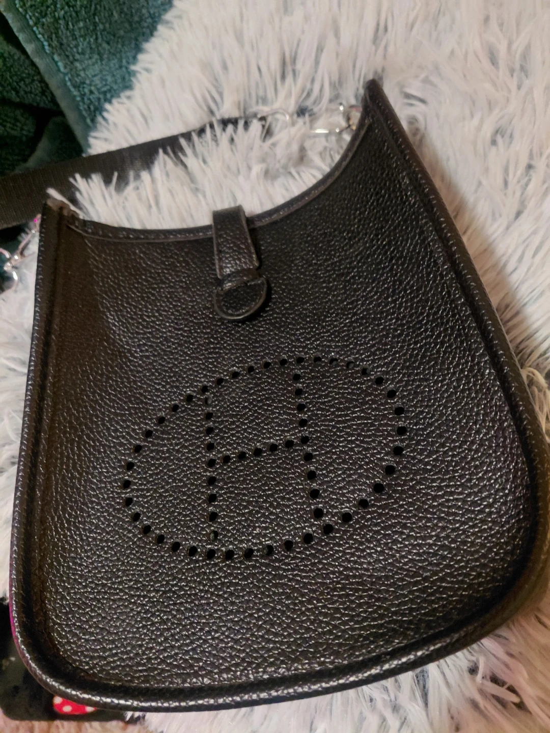 A stylish black leather crossbody bag. It features a secure snap closure and the iconic H perforated design. Leather material.