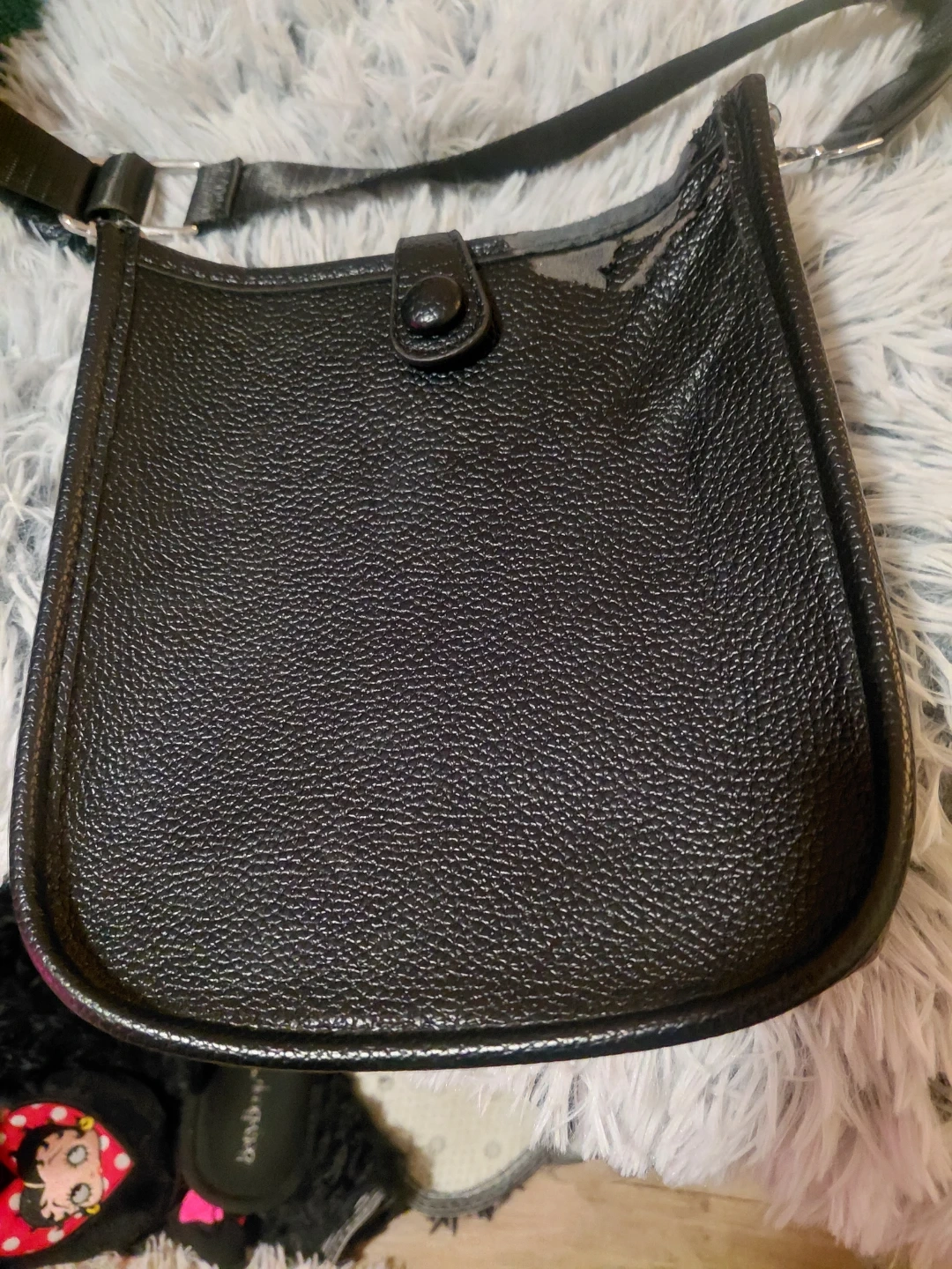 A stylish black leather crossbody bag. It features a secure snap closure and the iconic H perforated design. Leather material.