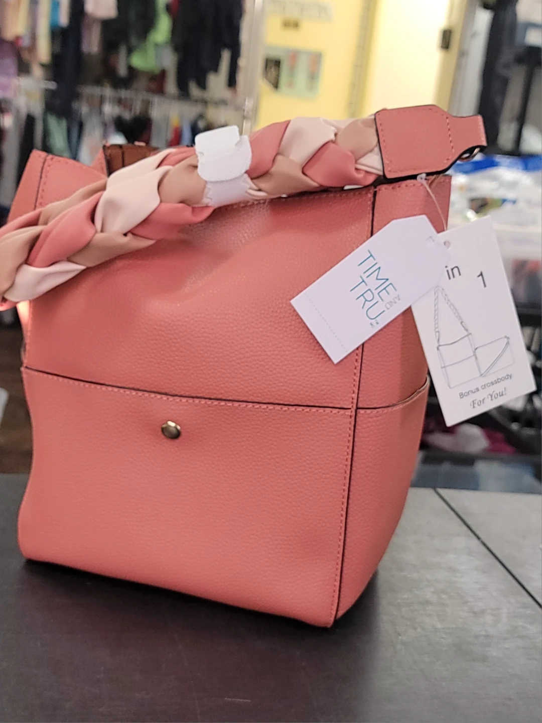 This Time and Tru bag is a versatile 2-in-1 shoulder bag with a bonus crossbody. It features a pink pebbled faux leather exterior with braided strap detail. This bag offers great storage options!