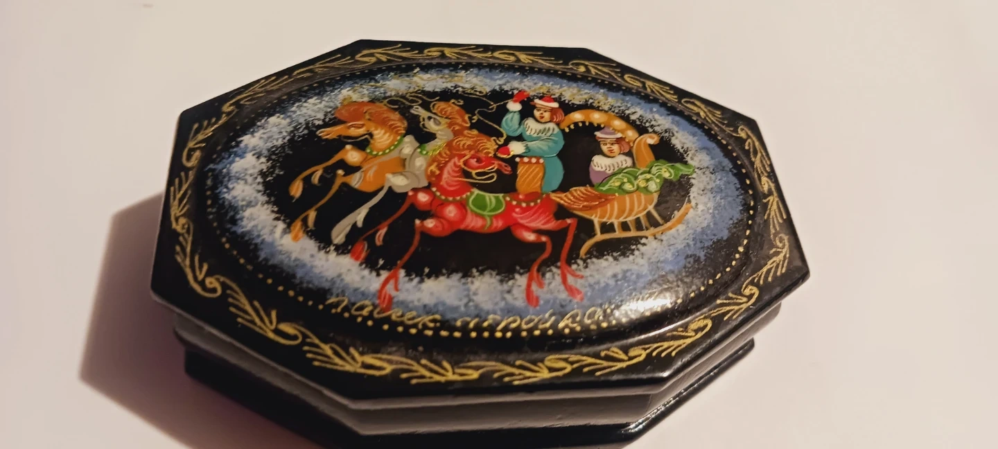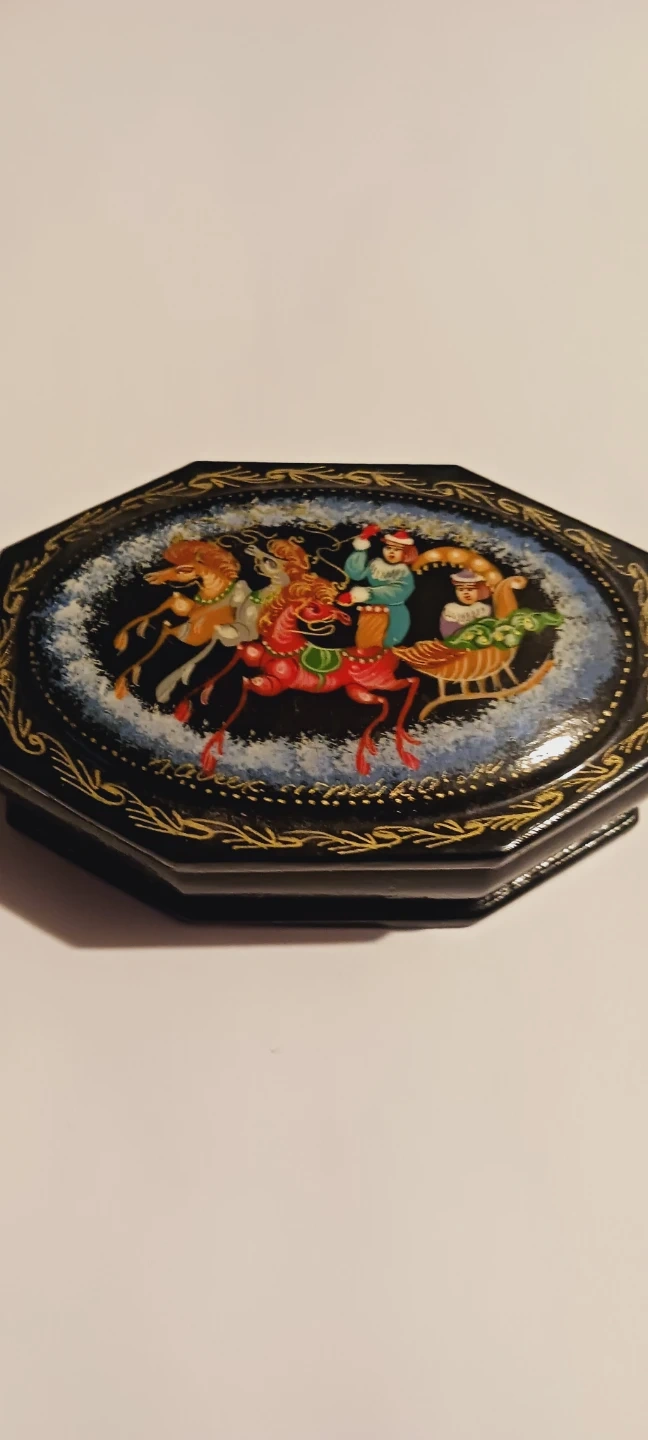 Russian Handpainted Decorative Lacquered Miniature Trinket Box with a hand-painted winter sleigh scene. Features a black exterior with gold trim and a red interior lining. It's octagonal in shape. 3"×2"×1". Excellent condition. ALL MY PRICES ARE NEGOTIABLE !!
