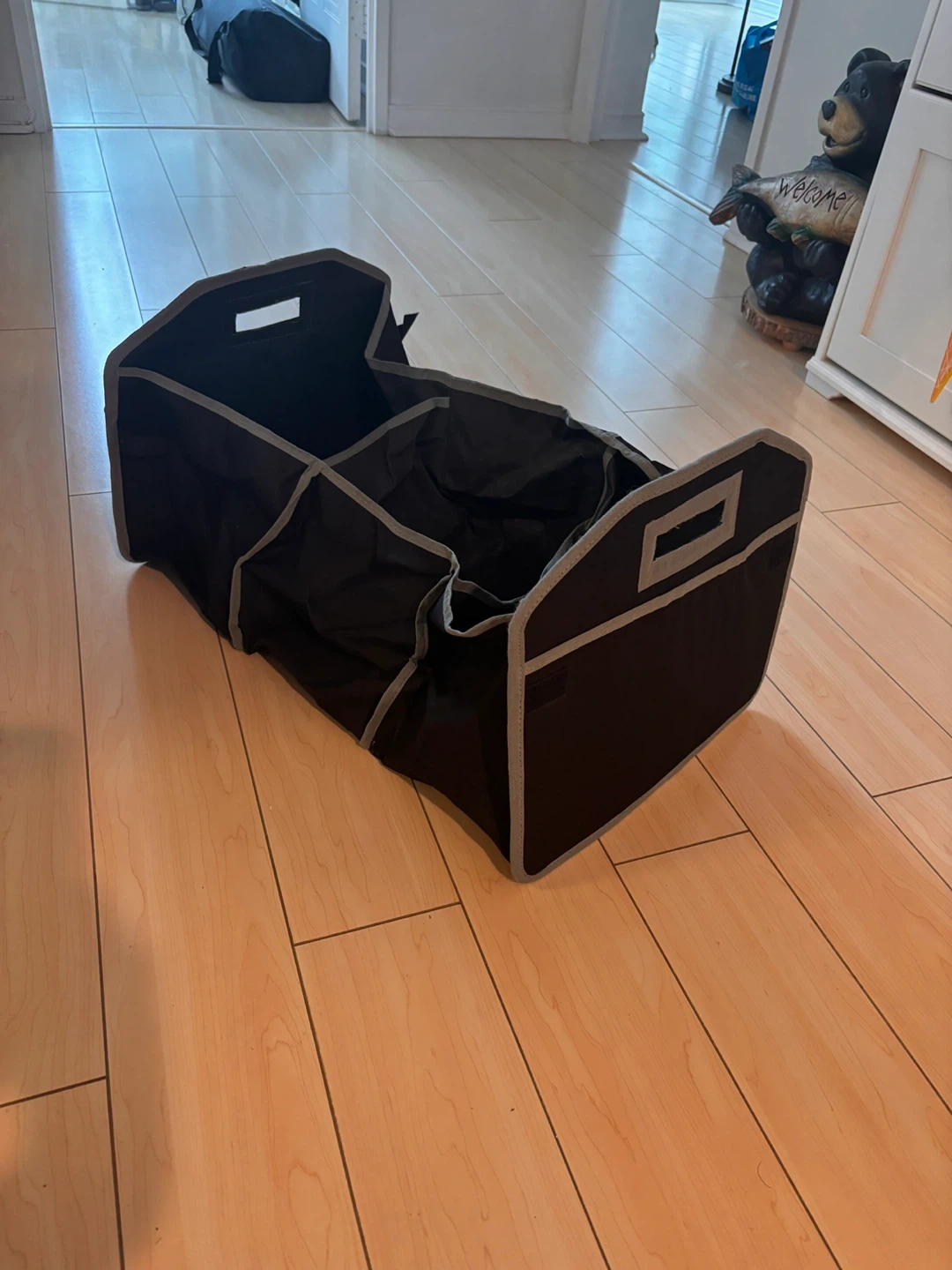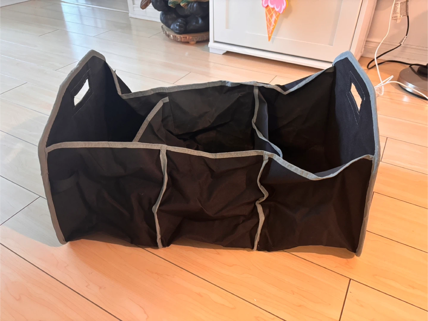 Here's a handy black trunk organizer to keep your car tidy! It's in great shape and ready to help you organize your belongings. Perfect for groceries, sports equipment, or anything else you need to keep in your trunk