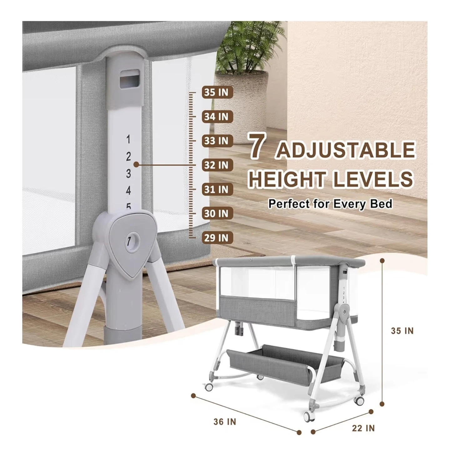 This convertible bassinet is a versatile option for your baby. It features 7 adjustable height levels, ranging from 29 to 35 inches, perfect for aligning with your bed. The unit also functions as a rocking bassinet and a standalone baby bassinet. It's designed to be close by your side.