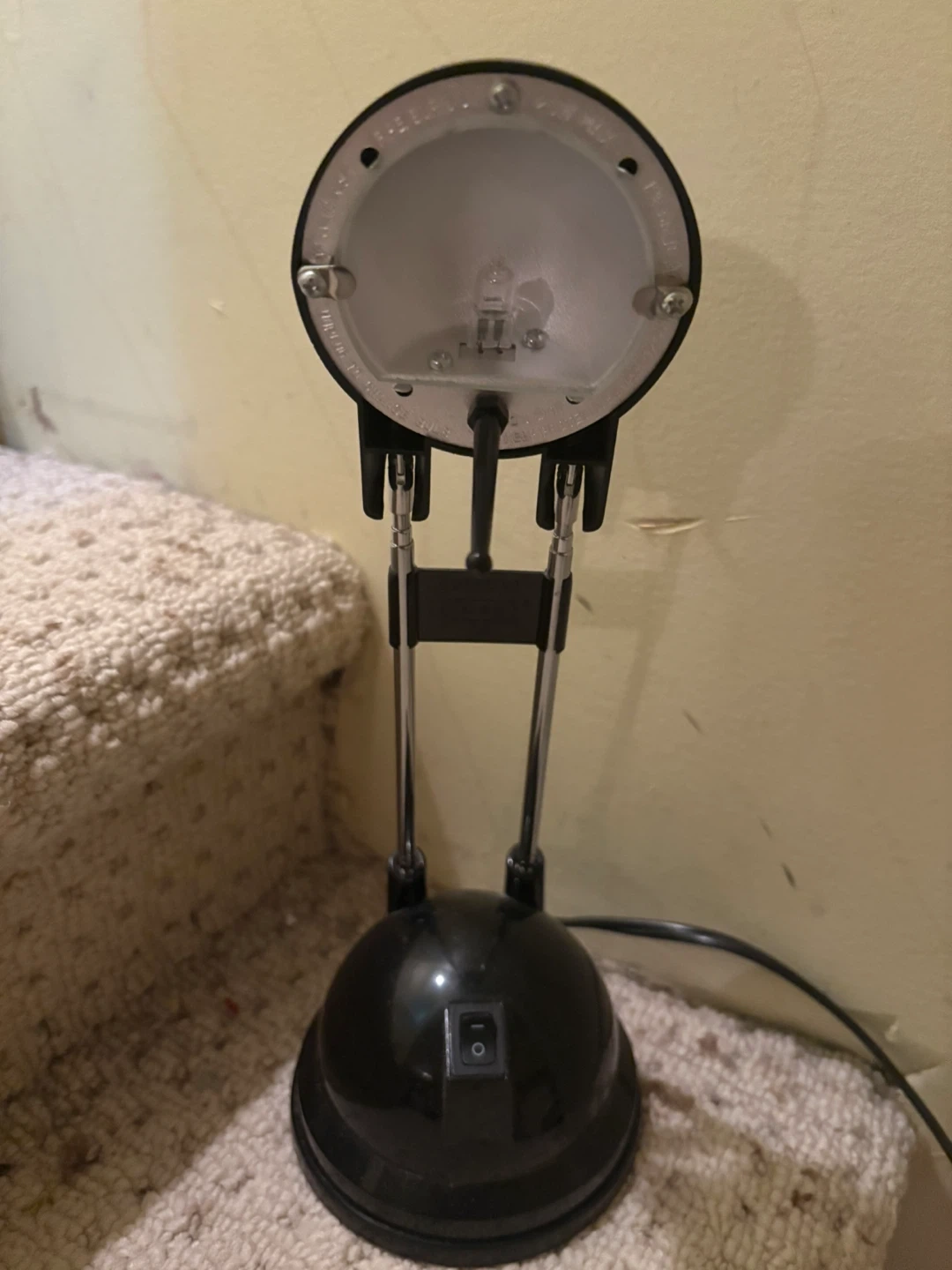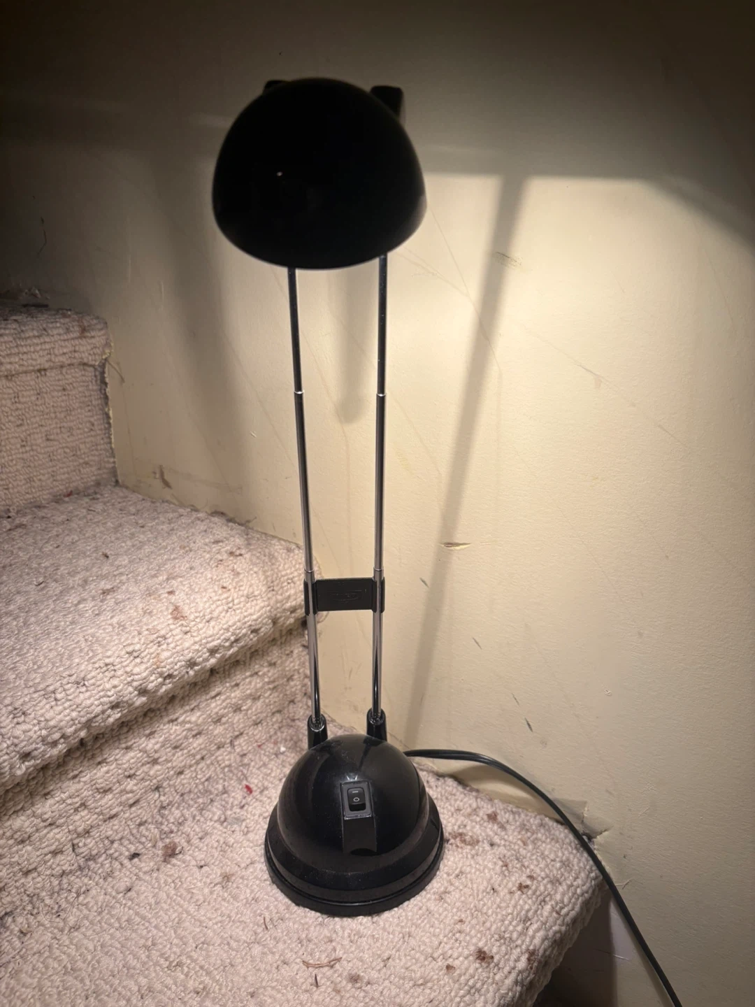 This black desk lamp has a flexible gooseneck design. It features a simple on/off switch on the base and uses a standard bulb. Great for a desk or workshop!