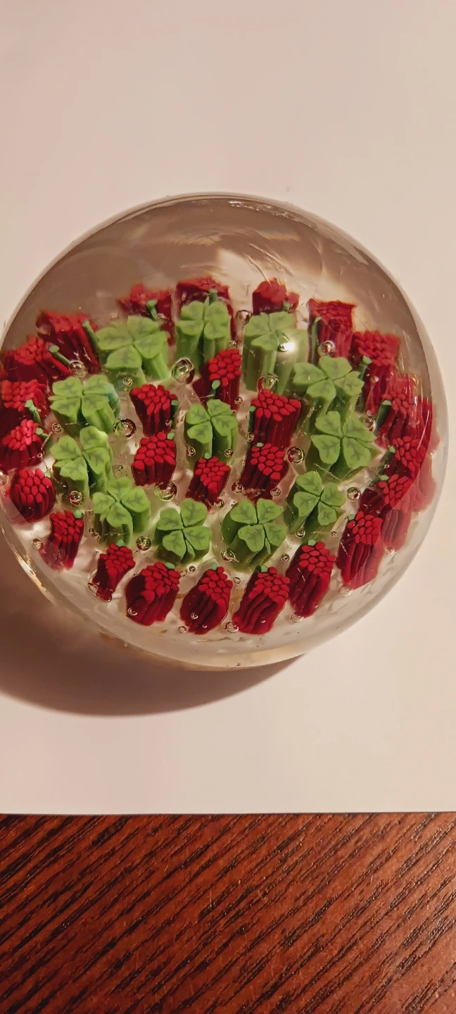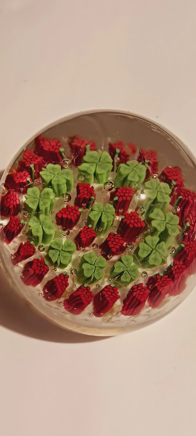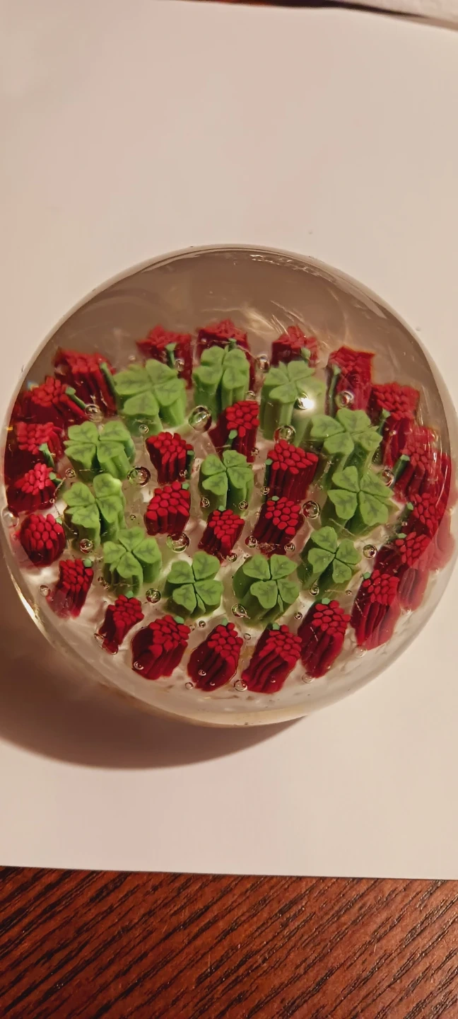 Beautiful Vintage Italian ๐ฎ๐น MuranoHandblown Art Glass Fratelli Toso Millefiori Clover ๐ Paperweight. This is a beautiful Handblown art glass paperweight. It features a colorful design with green clovers and red flowers encased within clear glass. It's a lovely decorative piece for any desk!!! Excellent condition. 3"ร3". Made in Italy ๐ฎ๐น. ALL MY PRICES ARE NEGOTIABLE !