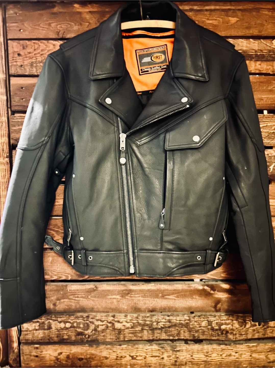 This is a men's black leather motorcycle jacket from First Classics. It's made of genuine leather and features a classic motorcycle jacket design. It's a great choice for riders looking for durable and stylish gear.