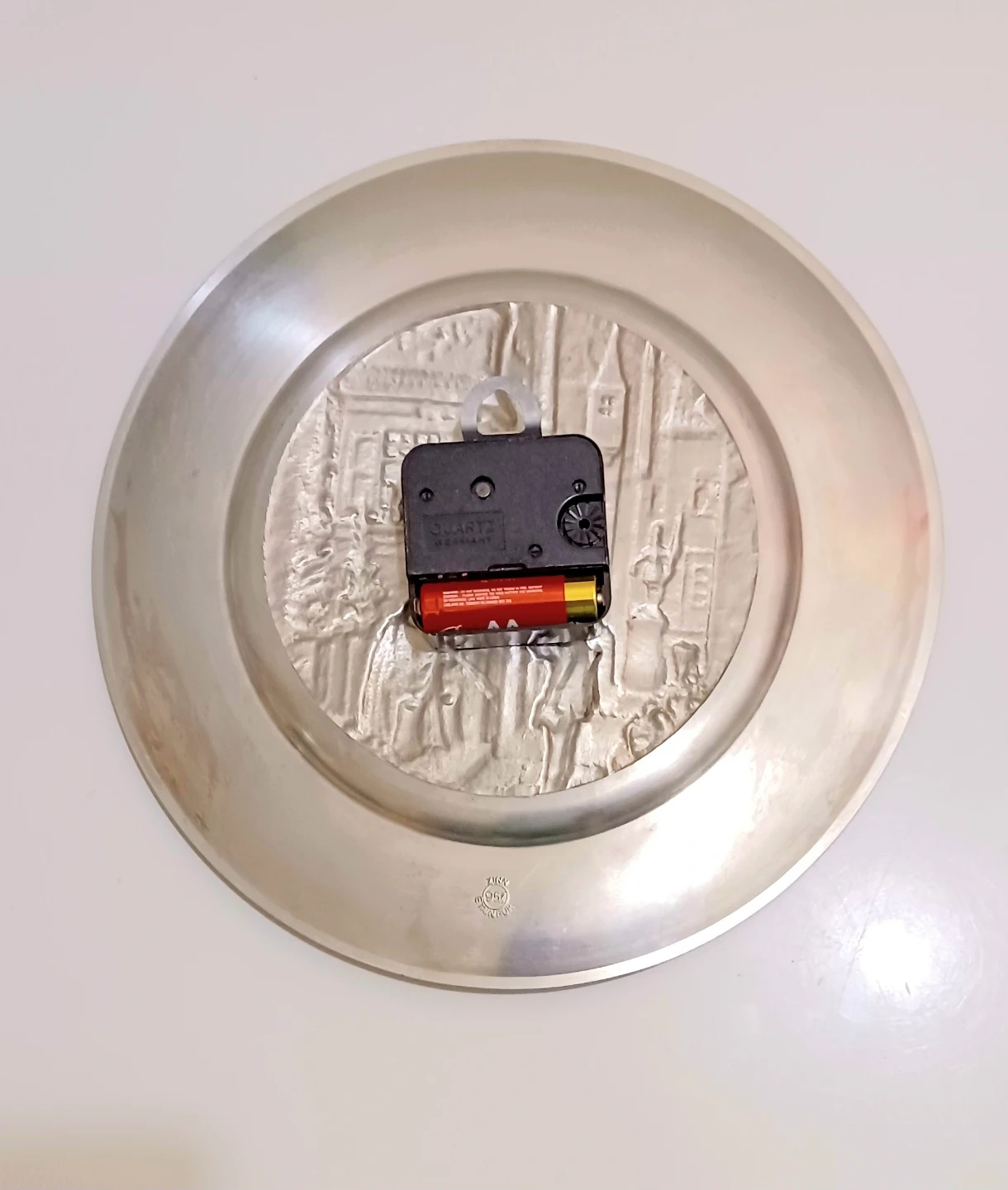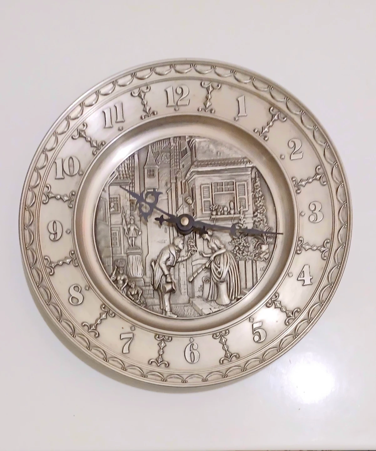 Add a touch of European charm to your home with this vtg German wall clock, featuring a detailed scene and classic Roman numerals.