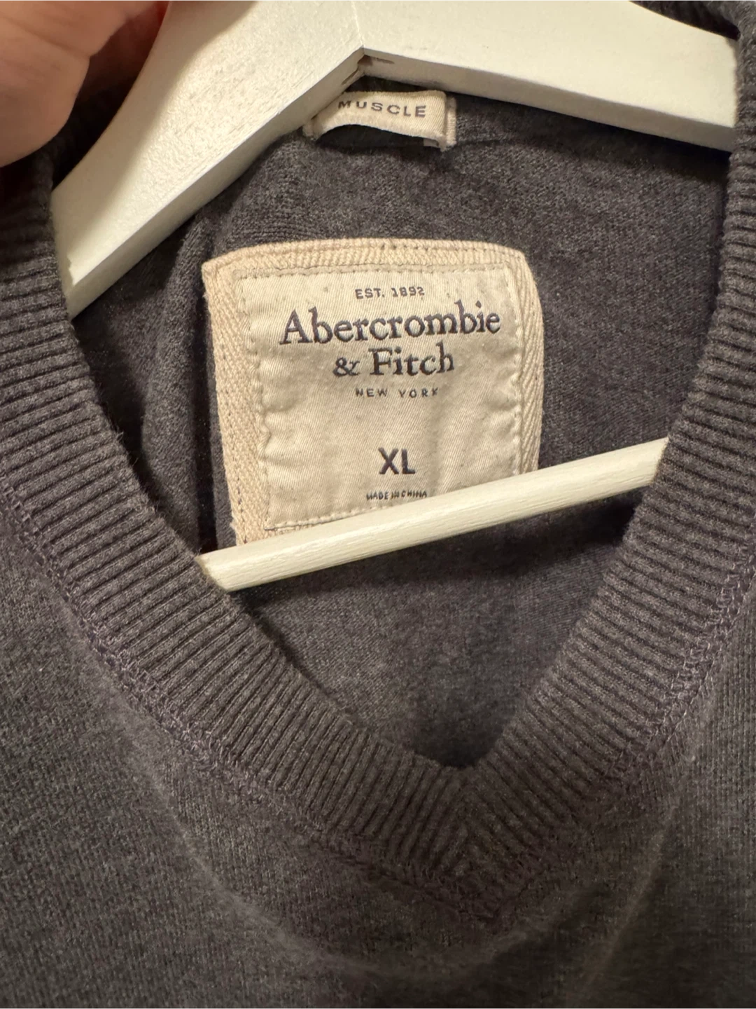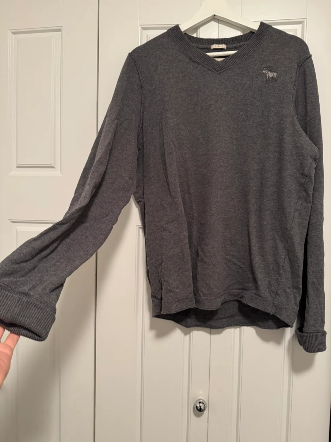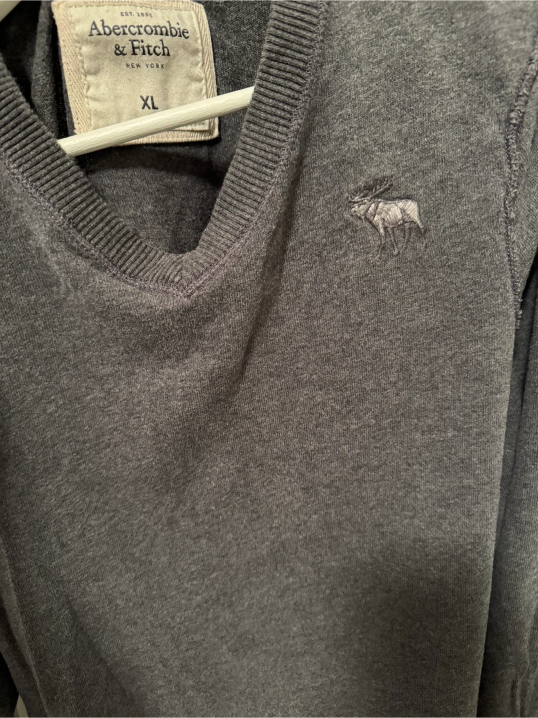 Comfortable charcoal grey V-neck sweater from Abercrombie & Fitch. It features the iconic moose logo embroidered on the chest. Made of soft material for everyday wear.