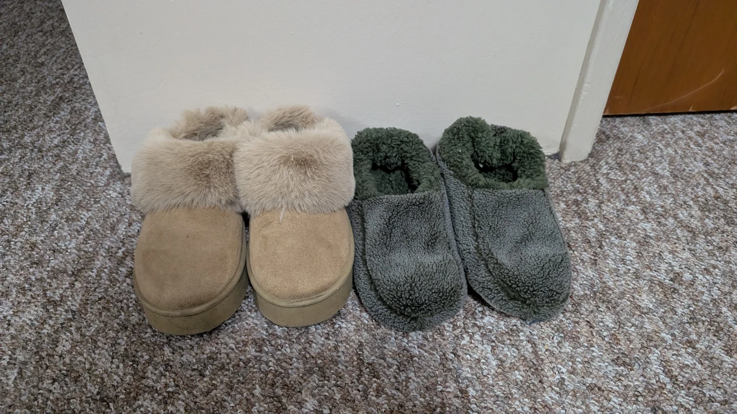 Two pairs of cozy, fuzzy slippers. One pair is tan with cream trim and the other is grey with green trim. Perfect for keeping your feet warm indoors!