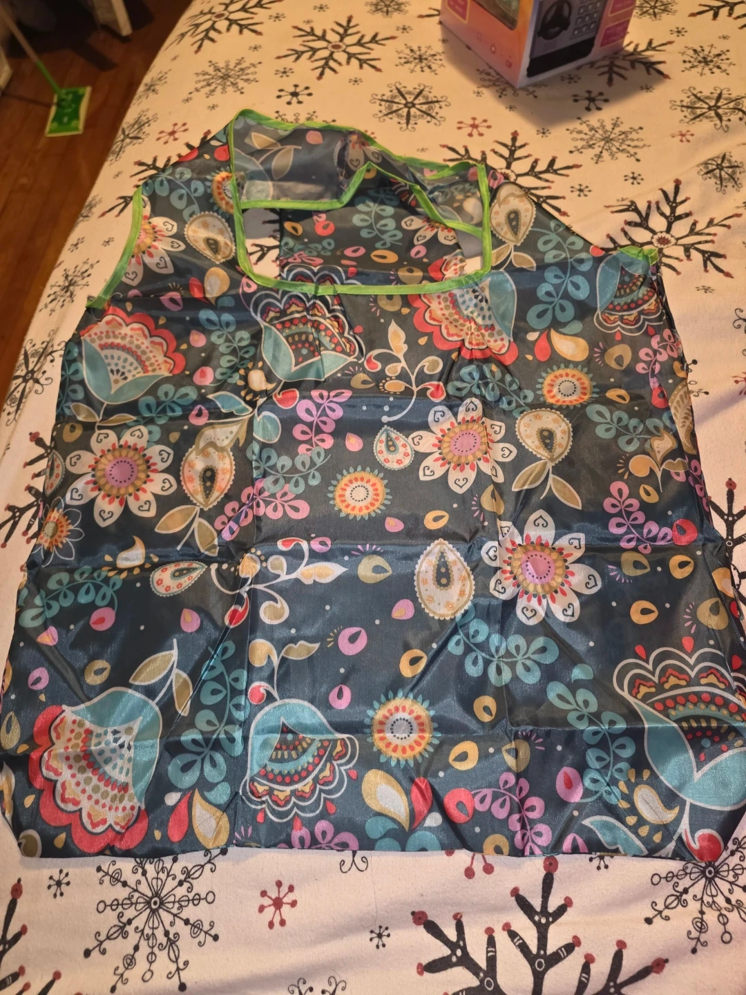 This is a reusable shopping bag with a colorful floral pattern. It's made of a durable, lightweight material and features sturdy handles for easy carrying. The bag folds up compactly for convenient storage.
