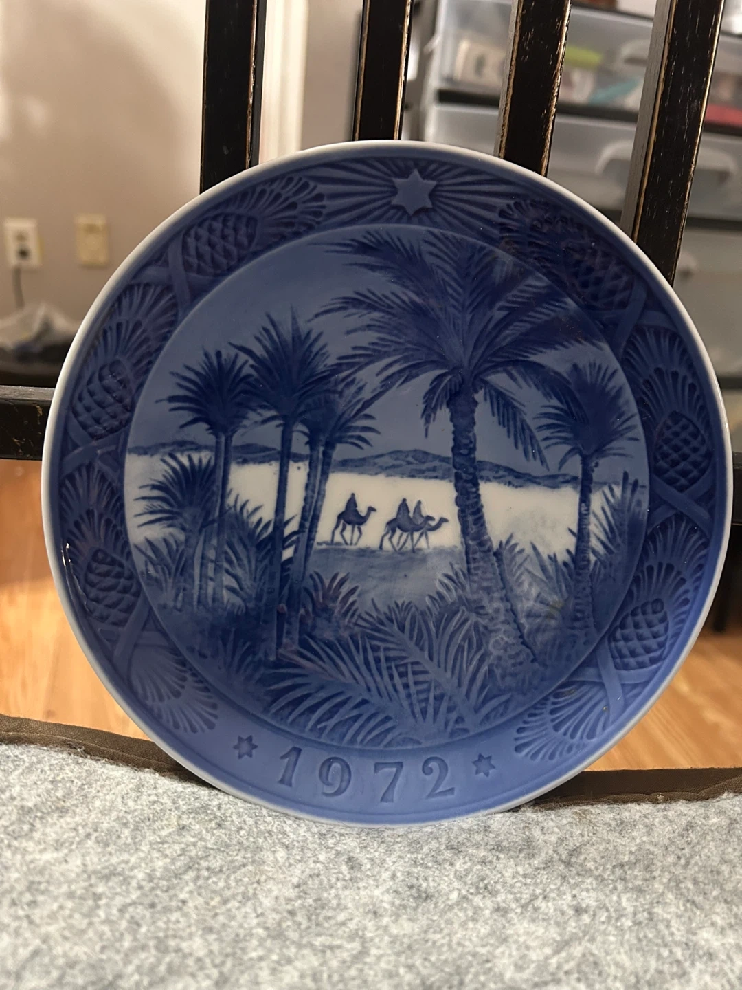 Vintage Royal Copenhagen annual Christmas plate from 1972, featuring a desert scene with palm trees and the Three Wise Men on camels, inspired by the Christmas story. Beautiful classic blue and white Danish porcelain with fine detailing.