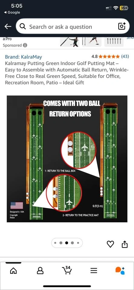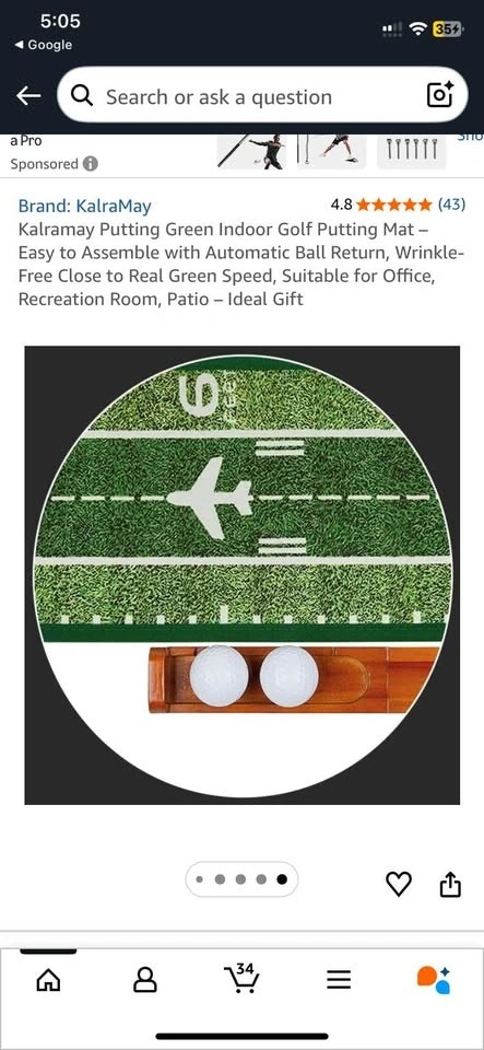 Buy & SellIndoor Golf Putting Green Mat with Auto Ball ReturnIndoor Golf Putting Green Mat with Auto Ball Return$75Easy to assemble putting green, wrinkle-free with real green speed. Suitable for office, recreation room, or patio. Makes an ideal gift.WHERE TO MEETCheck LocationView MapSELLERverifiedShirinBrock Ridge22915 reviews0 chats·0 favorites·2 viewsSEND CHAT TO SELLERHi Shirin! I’m interested in your listing.Hi Shirin! I’m interested in your listing.Get the Karrot app to chatSign In to chat
