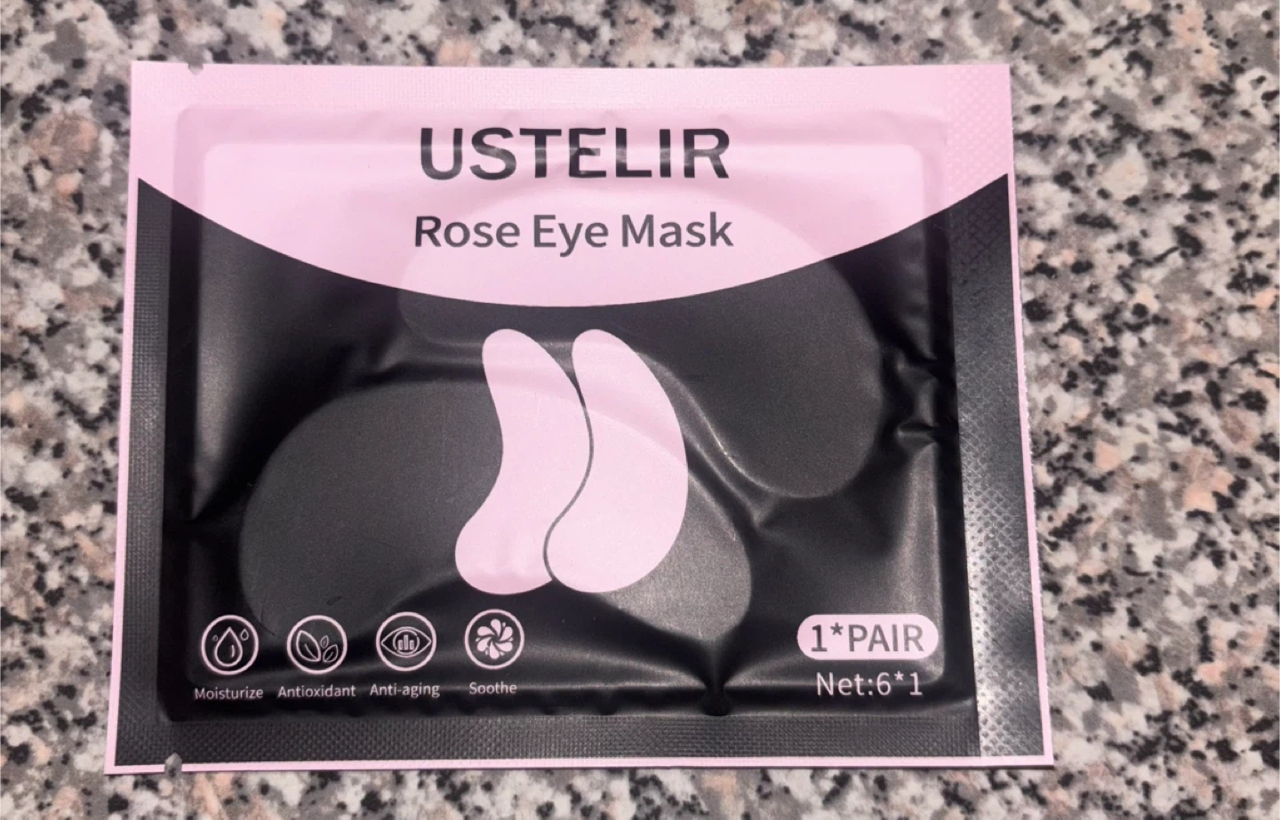 This is a Ustelir Rose Eye Mask for one pair. It's designed to moisturize, provide antioxidant benefits, fight aging, and soothe the under-eye area. One pair is included in the net weight of 6 grams.