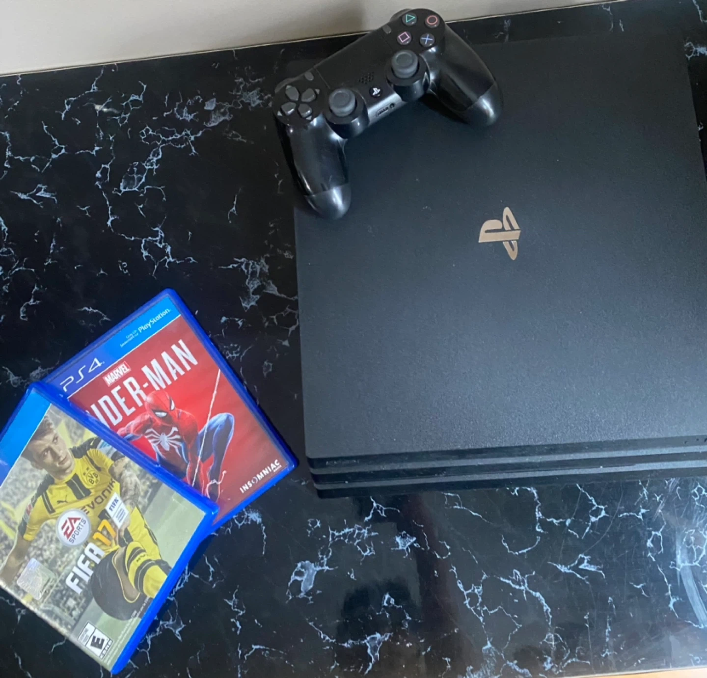 Selling a Sony PlayStation 4 Pro console, 1TB storage. It comes with a DualShock 4 controller and two games: Marvel's Spider-Man and FIFA 17.