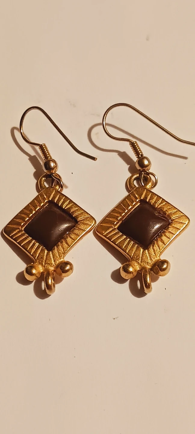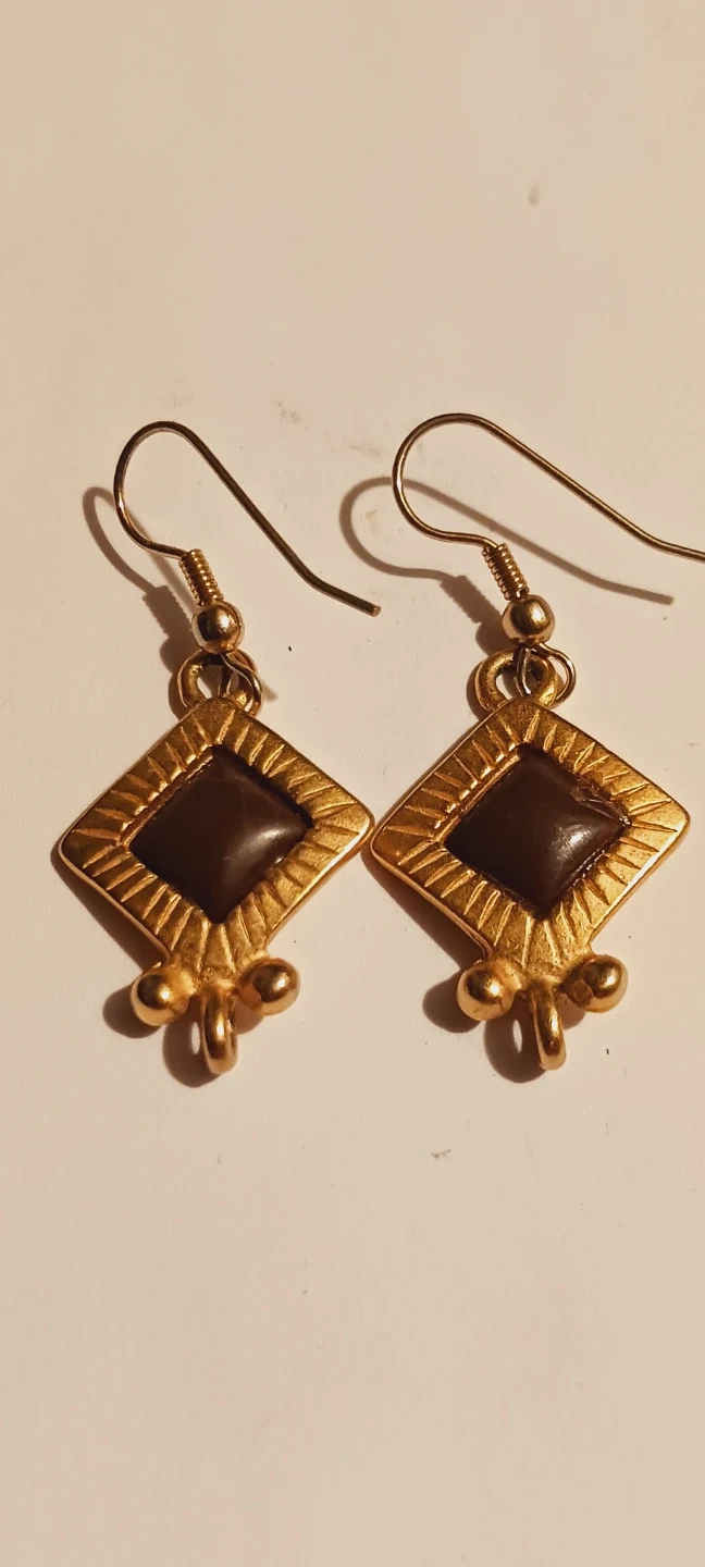 These dangle earrings feature a gold tone metal with a dark brown diamond shaped inlay. The earrings have a hook closure. They're about 1.5 inches long. Excellent condition. ALL MY PRICES ARE NEGOTIABLE !!
