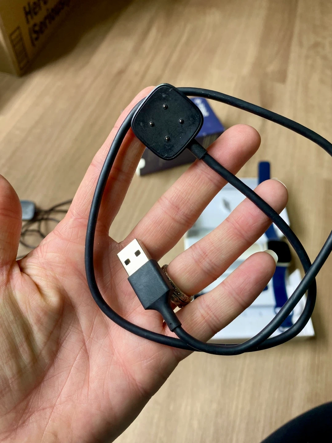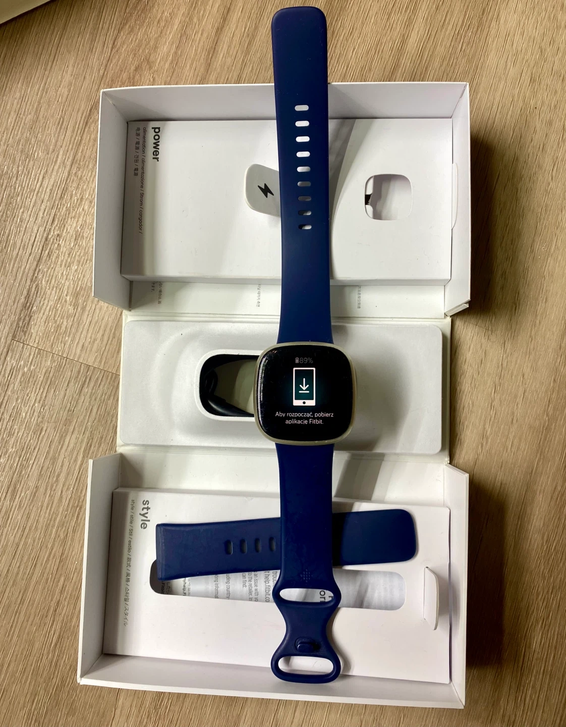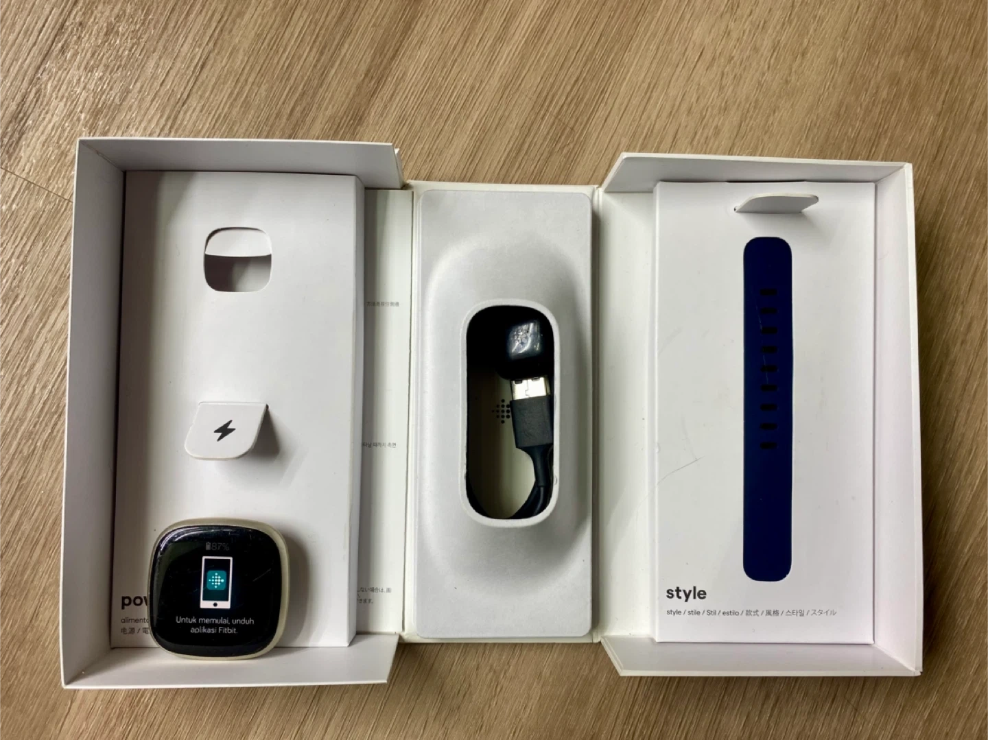 Fitbit comes in the original box, with the midnight coloured infinity band (two sizes), official Fitbit charger and free leather bands and extra charger.