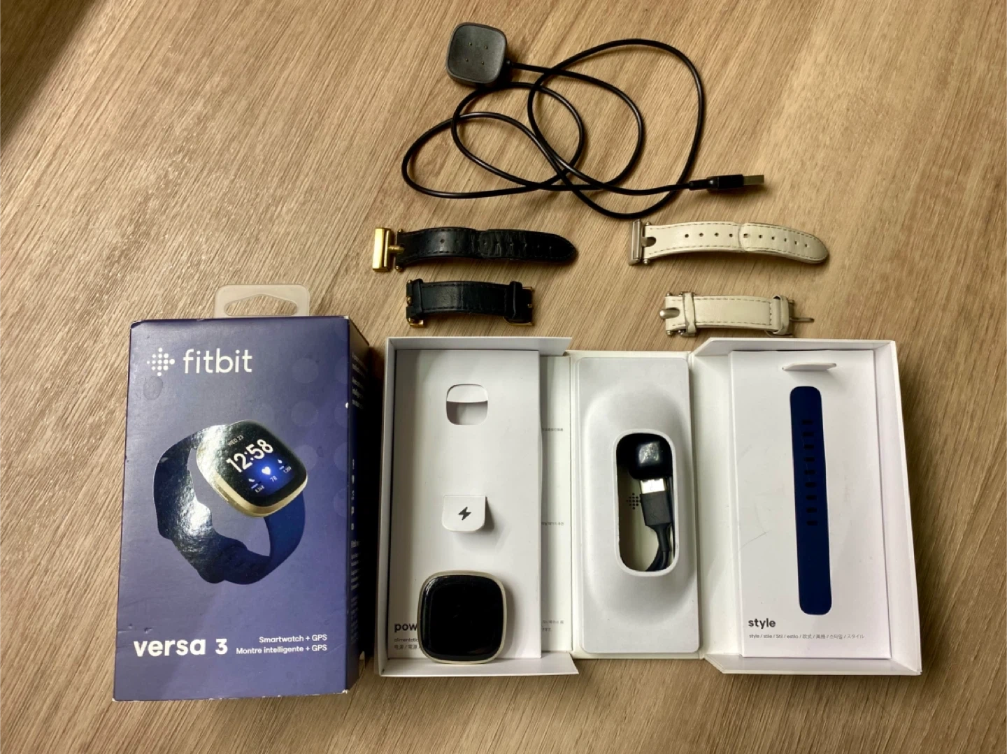 Fitbit comes in the original box, with the midnight coloured infinity band (two sizes), official Fitbit charger and free leather bands and extra charger.