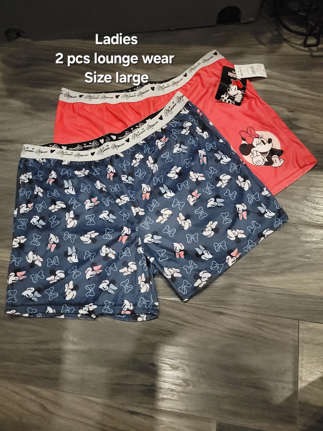 This is a 2-piece set of ladies lounge wear. It features a fun Minnie Mouse pattern and a solid coral colour. Both pieces are size large.