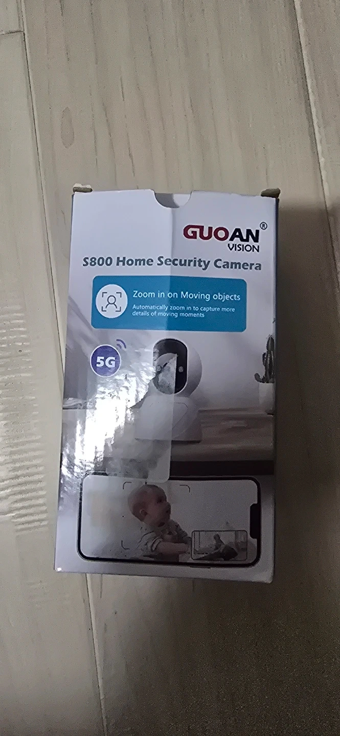 This is a GUOAN VISION S800 Home Security Camera. It features zoom in on moving objects. The app is available on the App Store and Google Play.