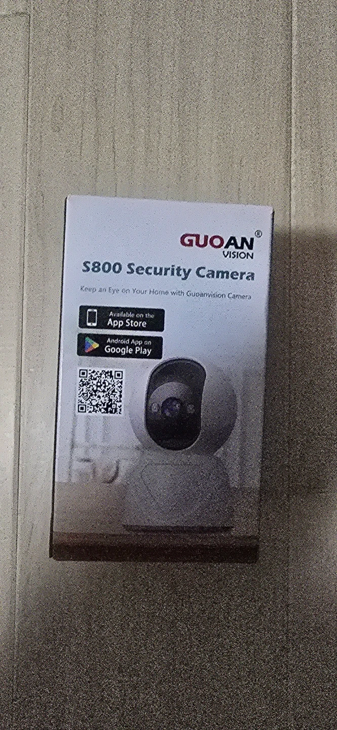 This is a GUOAN VISION S800 Home Security Camera. It features zoom in on moving objects. The app is available on the App Store and Google Play.