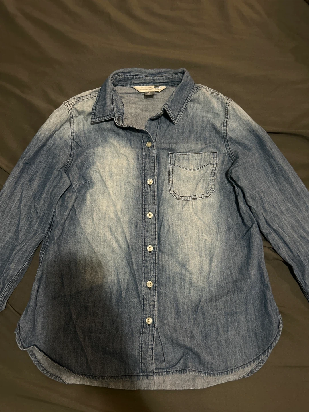 This is an brand new Old Navy classic denim shirt in a size small. It's made of a soft denim material and features a button-up front with a chest pocket. This shirt is a versatile wardrobe staple!