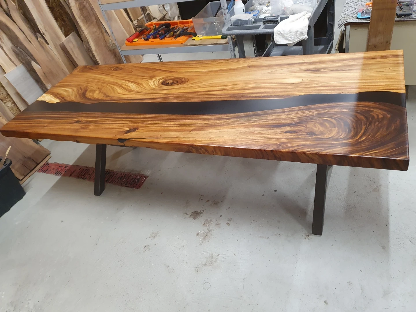 Beautiful live edge dining table featuring a striking dark epoxy river. Its natural wood grain and sleek design make it a unique centrepiece for any dining space. The sturdy metal legs provide excellent support.