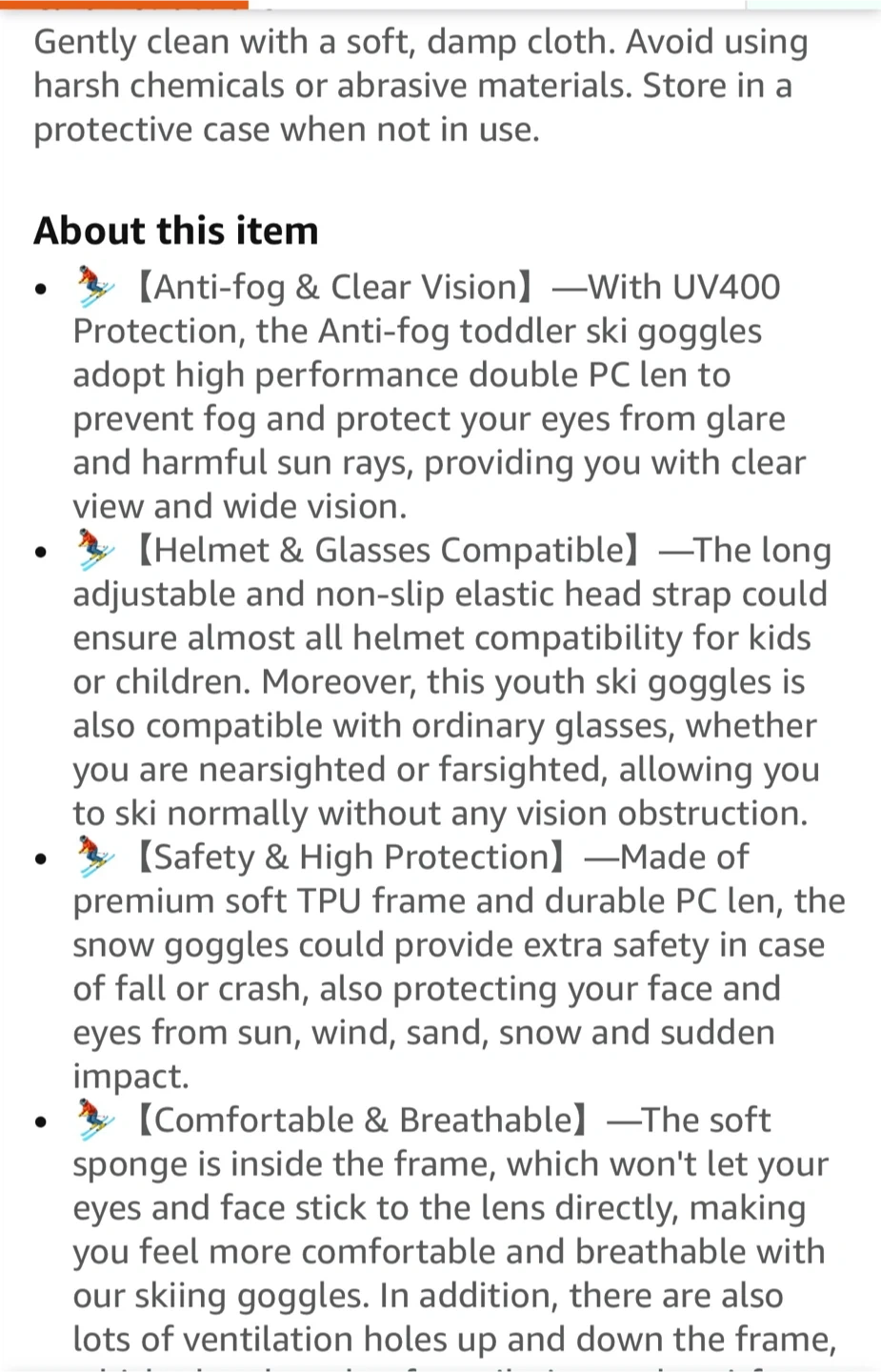 These youth ski goggles offer anti-fog and UV400 protection for clear vision. They're helmet and glasses compatible with a soft TPU frame and PC lens. The comfortable sponge lining ensures breathability during use. Daughters tried on but doesn’t like print. 20$ each more information in second photo. 4.7 out of 5 rating on Amazon!! Top pair sold bottom ones available