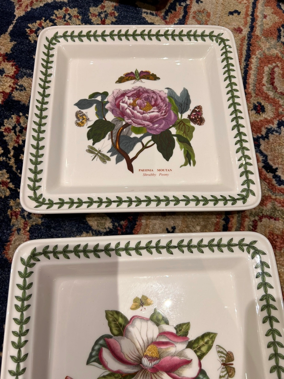 Two square decorative plates featuring botanical illustrations of a Paeonia Moutan and a Magnolia Stellata. Both plates are adorned with a classic green vine border. They're perfect for display or adding a touch of nature to your table.