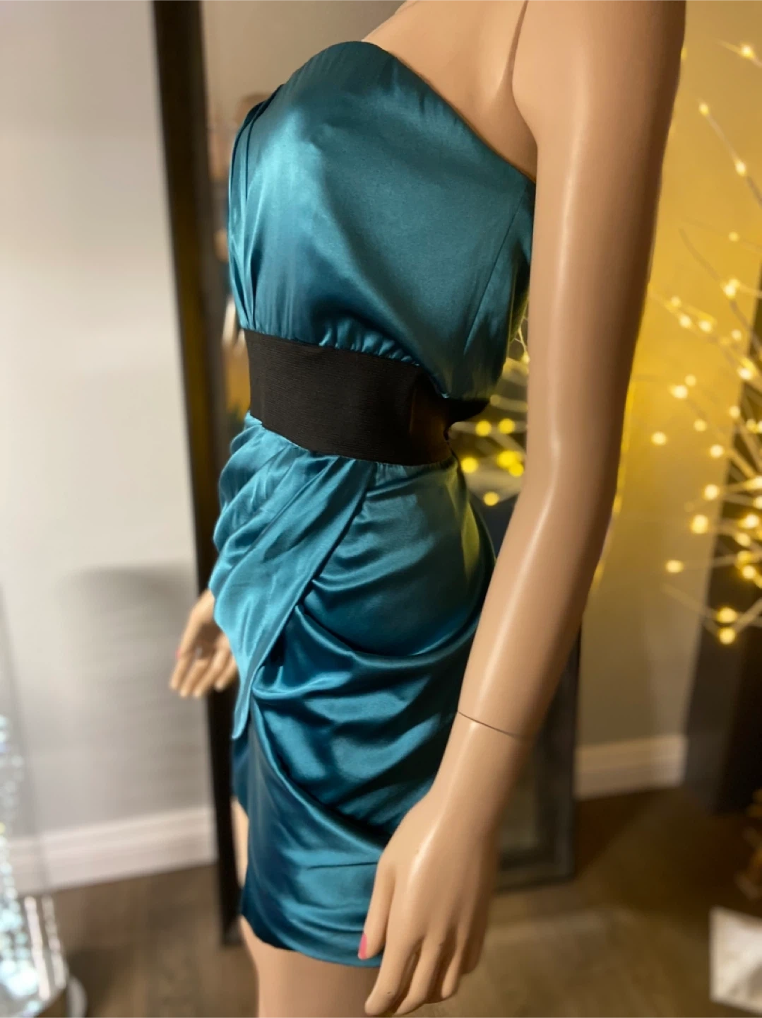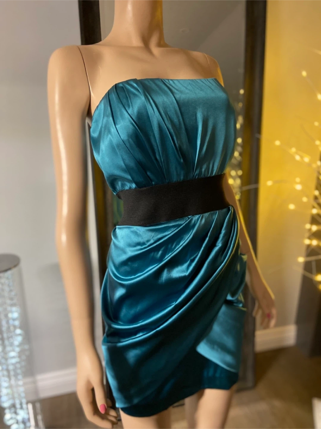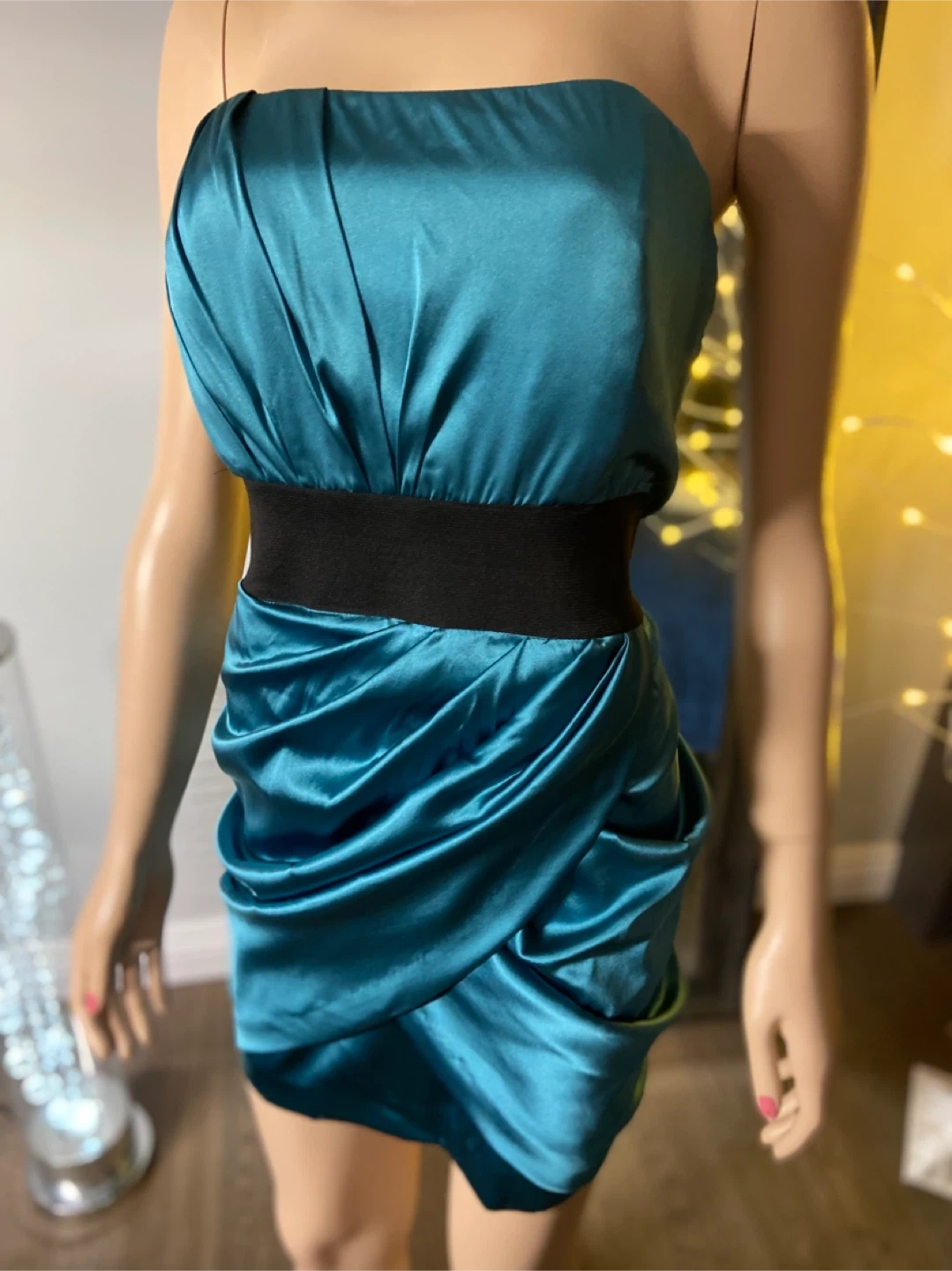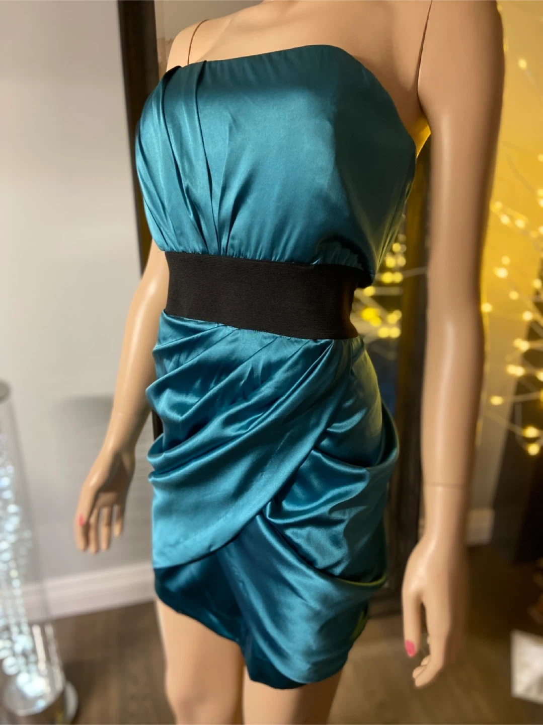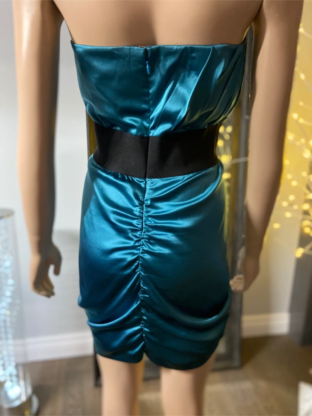 NWT Teal Stretchy Strapless Ruched Mini Dress with Black Band L