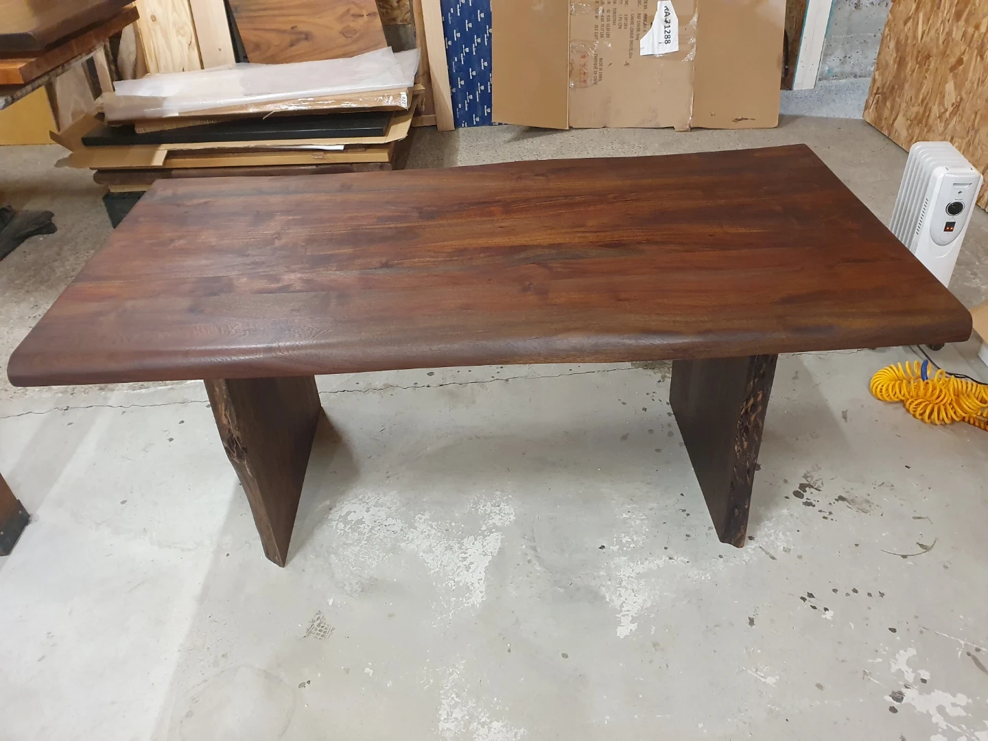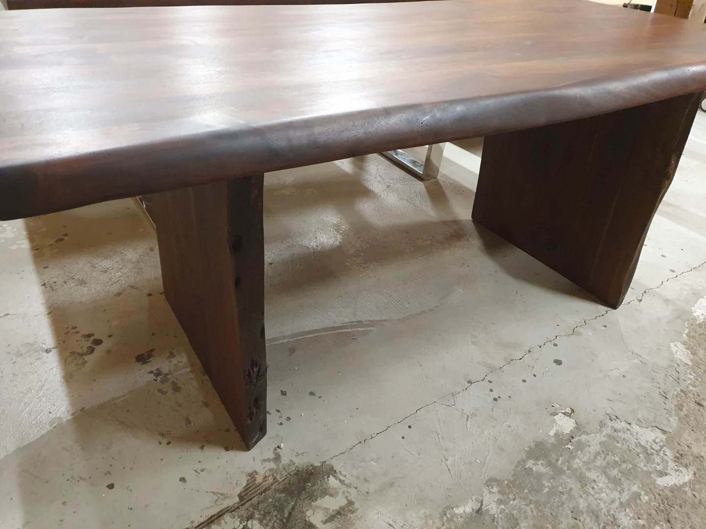 Beautiful solid wood dining table with a live edge. This piece showcases the natural beauty of the wood grain. Its sturdy construction makes it a functional centrepiece for any dining room.