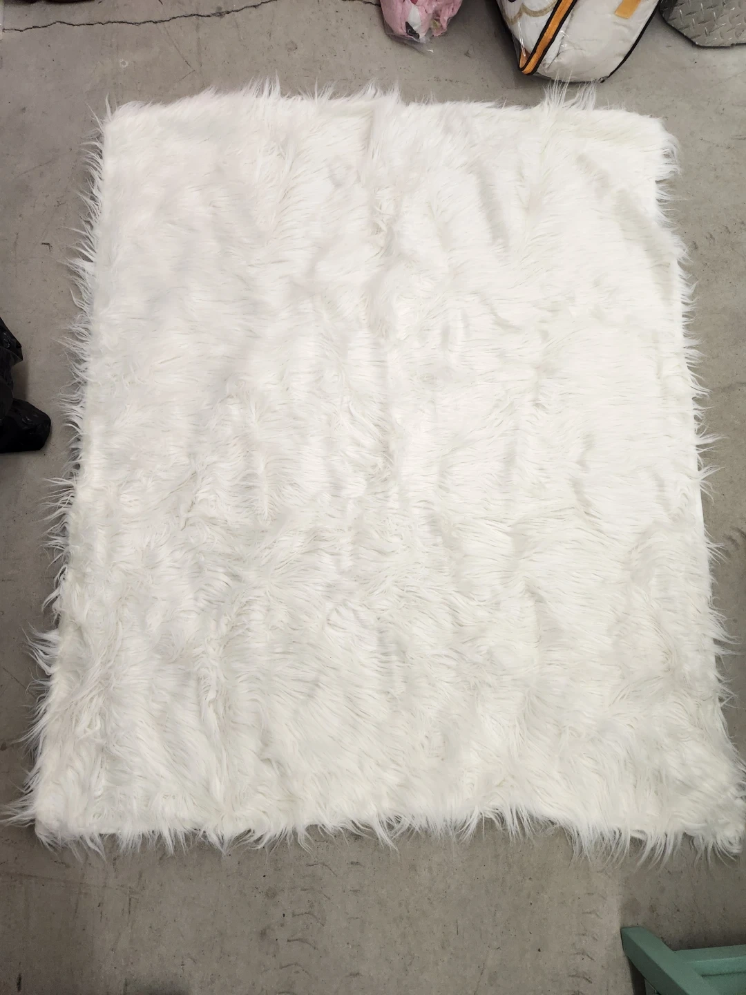 Soft white faux fur bed cover. It's fluffy and has a shaggy pile. Adds a lots of interest and a cozy feel to any room!used for staging