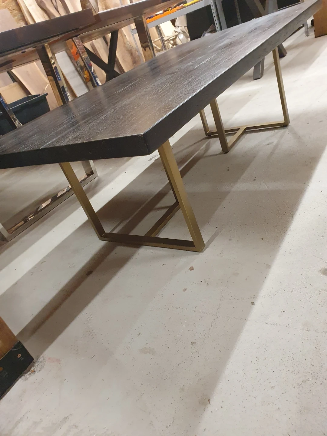 Solid dark wood coffee table with a striking gold metal base. It's perfect for family dinners and entertaining guests. The sturdy construction ensures durability for years to come.