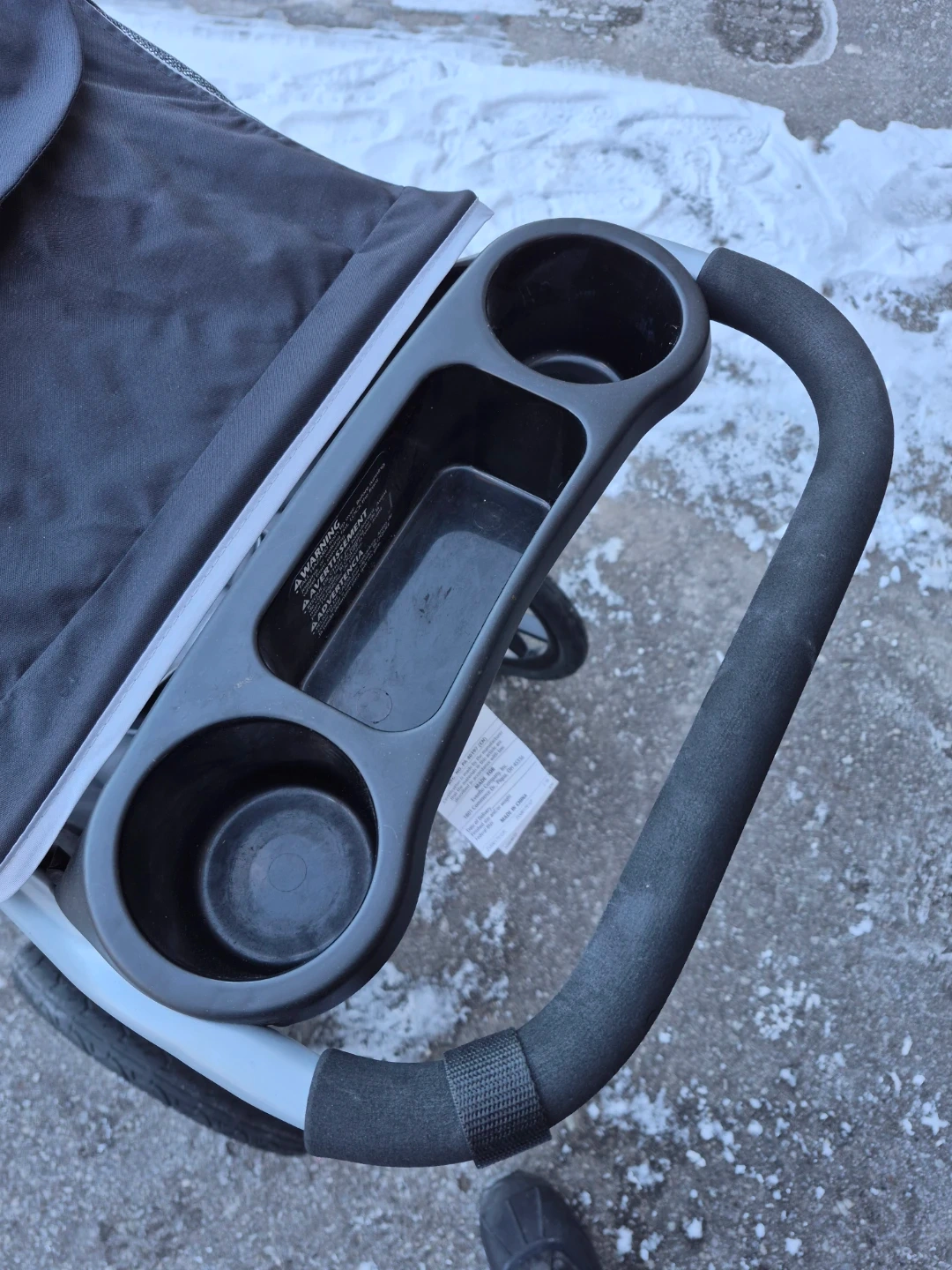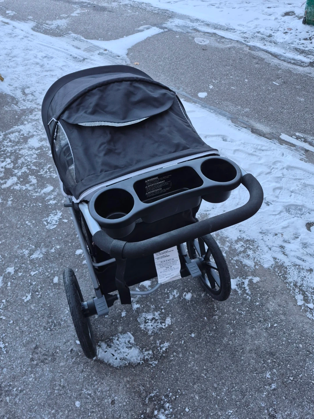Black, features a cup holder and tray for convenience. It's designed for active parents, making it great for jogging or everyday walks. The stroller is made with durable materials.