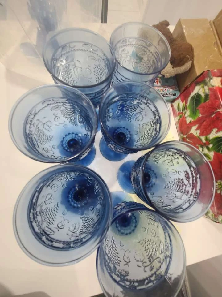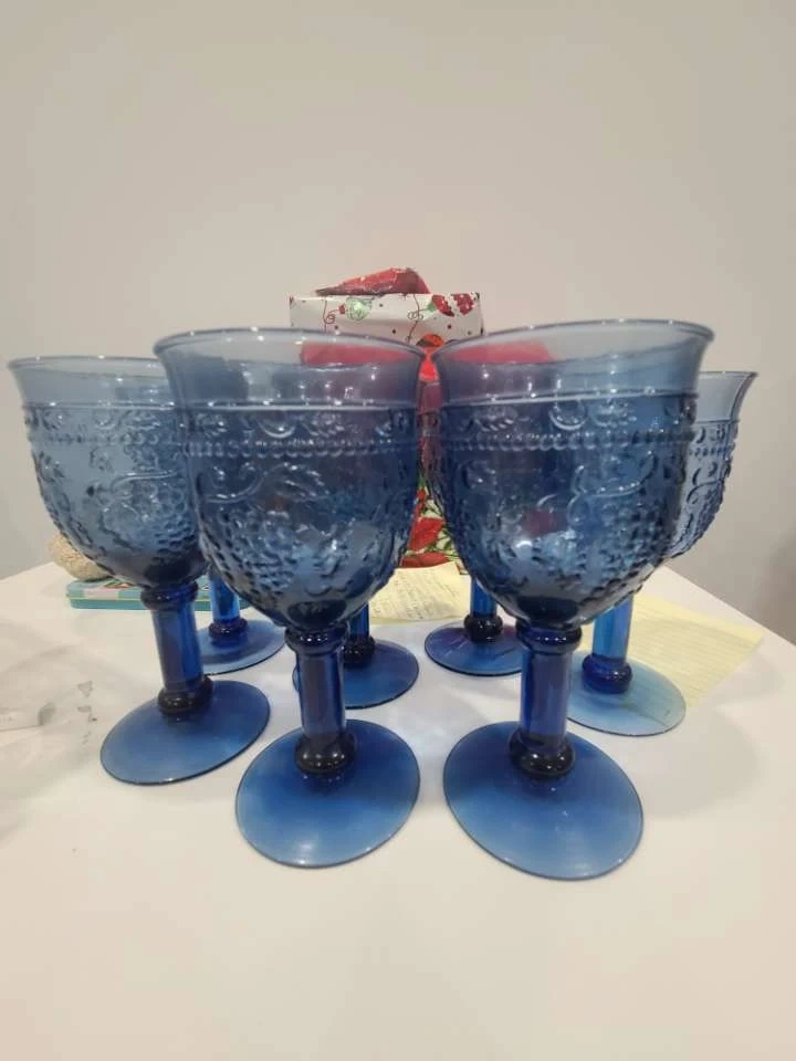 This is a set of seven blue glass goblets with an embossed grape vine pattern. They're perfect for serving wine or other beverages. Add a touch of vintage charm to your table setting!