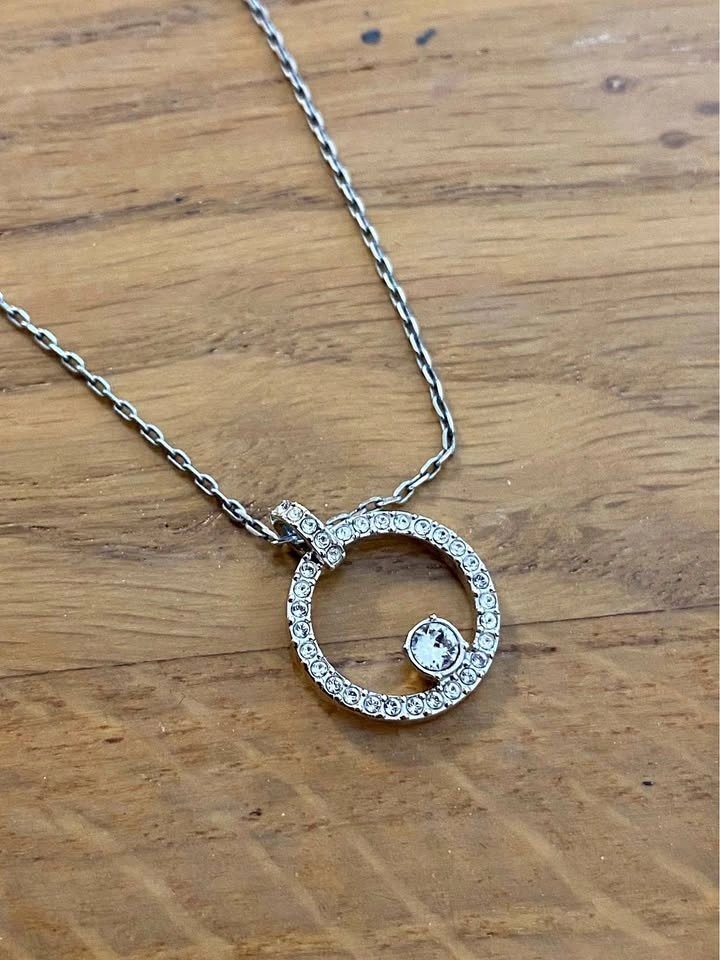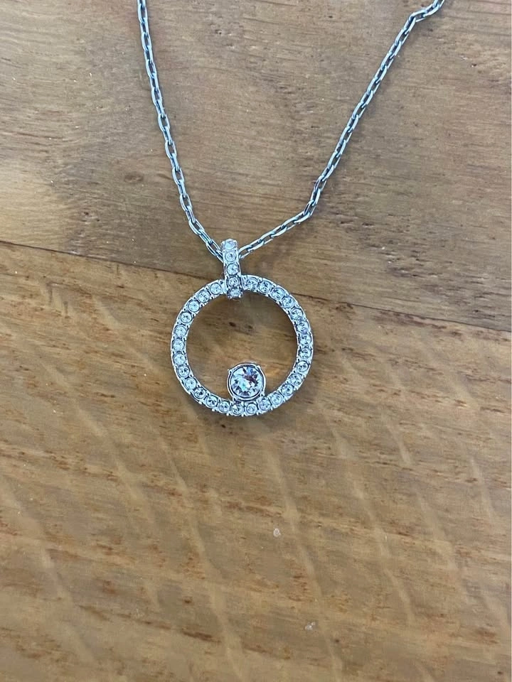 Beautiful Swarovski pendant with chain, in perfect condition. Has been worn just once or twice. Features crystals in the pendant with a lobster style clasp; rhodium plated. Chain length: 38 cm (15”). Pick-up ONLY at Boundary and Hastings.