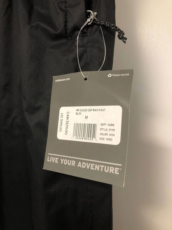Eddie Bauer men's rain pants, size medium. Brand new with label attached, never worn. Selling because they fit closer to a large size. Packs well for travel.