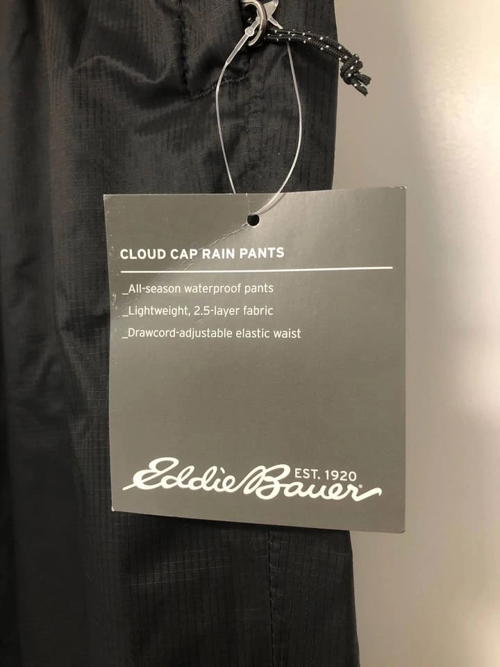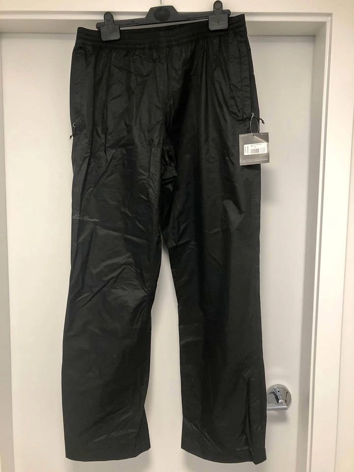 Eddie Bauer men's rain pants, size medium. Brand new with label attached, never worn. Selling because they fit closer to a large size. Packs well for travel.