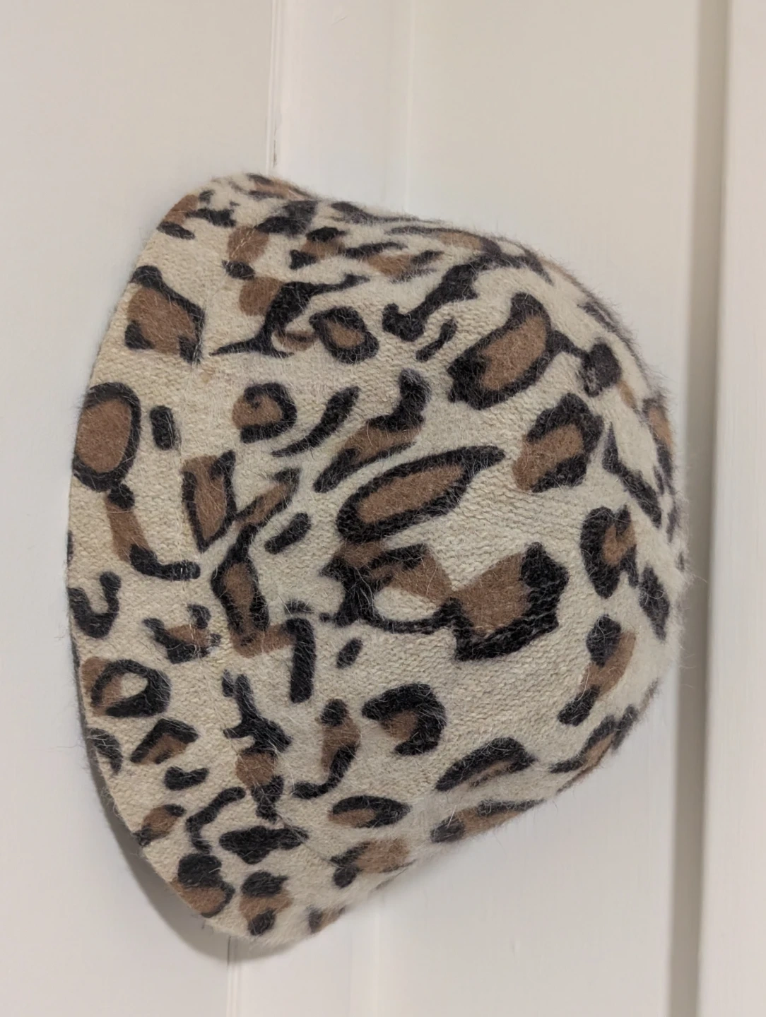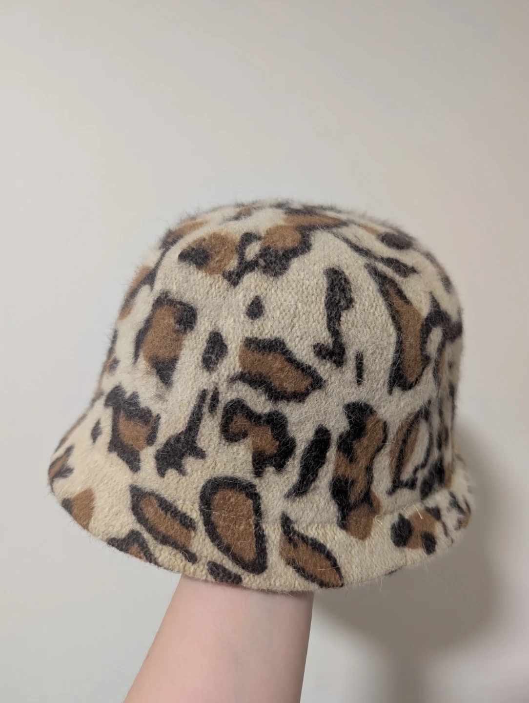 A cozy bucket hat featuring a fun leopard print design. Made with a blend of 80% angora and 20% polyester. It's perfect for adding a touch of style to your outfit on cooler days!
